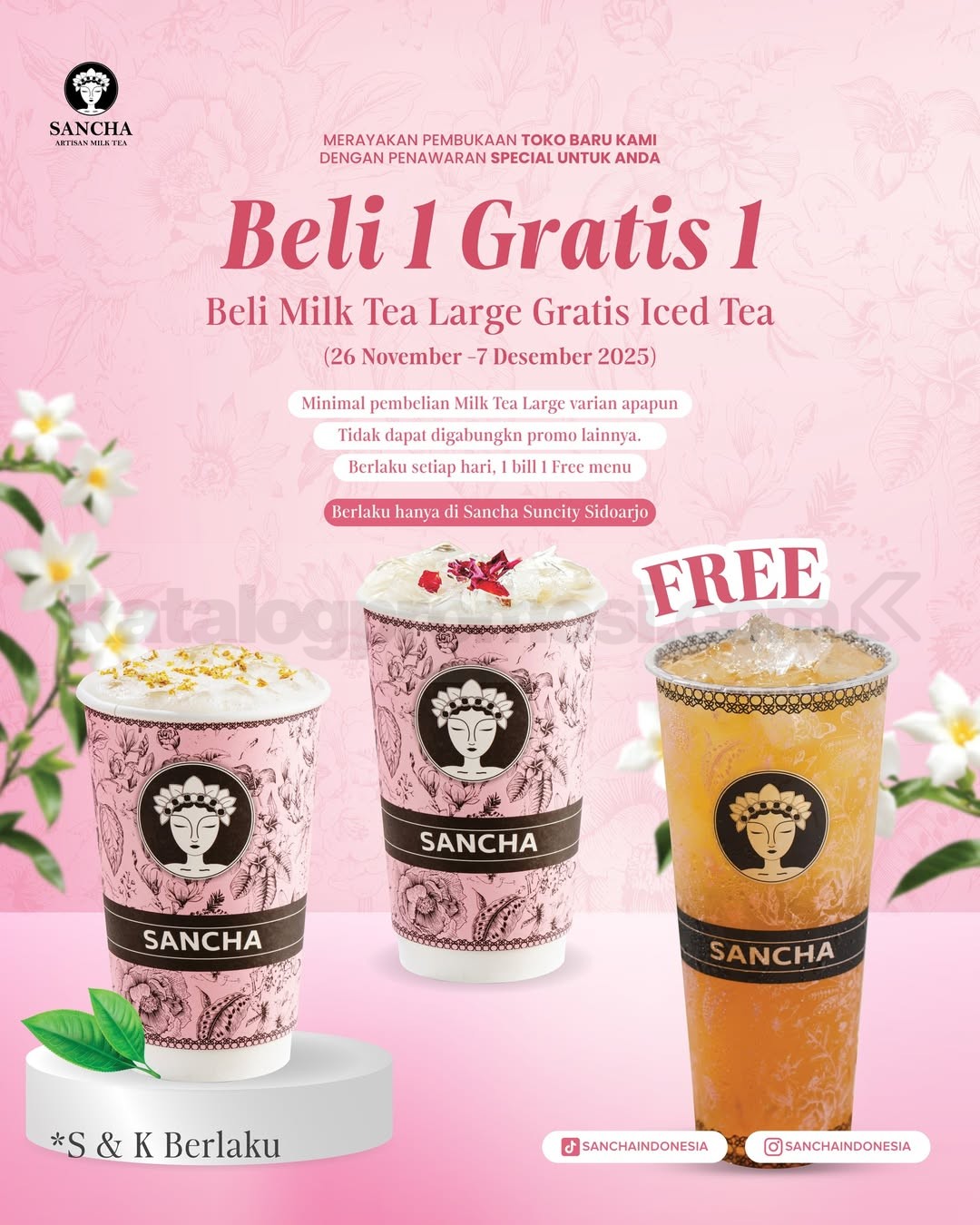 Promo Sancha Grand Opening Buy 1 Get 1 Free nikmati Large Milk Tea semua varian, berlaku 26 November – 7 Desember 2025 di outlet Sancha Suncity Sidoarjo