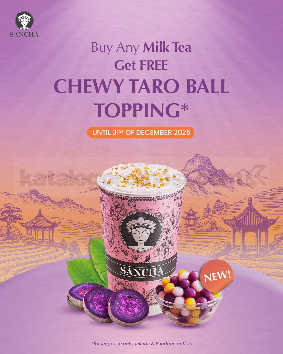 Promo Sancha Gratis Chewy Taro Ball Topping untuk setiap Large Milk Tea berlaku sampai 31 Desember 2025 di outlet Jakarta dan Bandung.