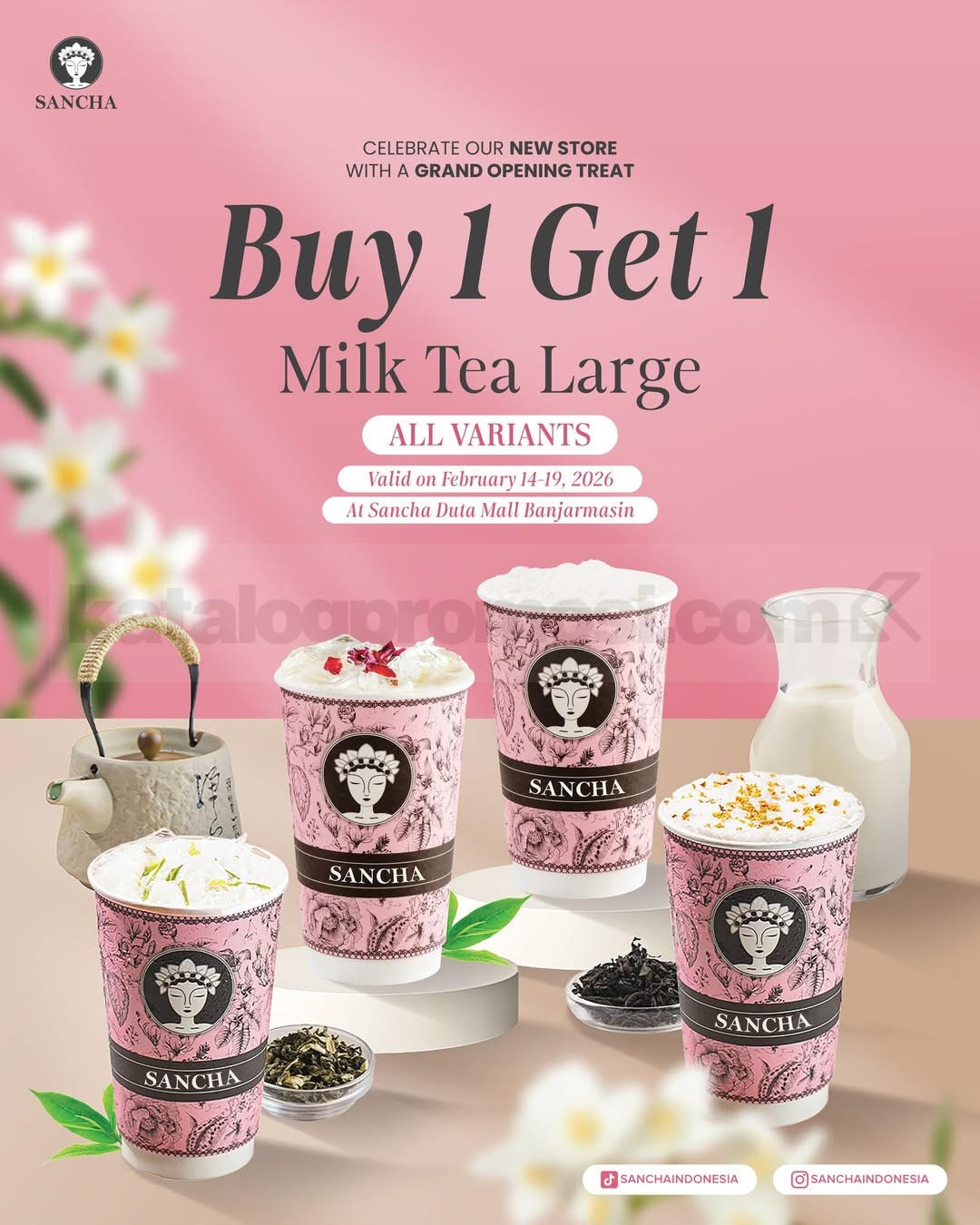 Promo Sancha Opening Duta Mall Banjarmasin Buy 1 Get 1 Free Large Milk Tea berlaku mulai tanggal 14 Februari 2026 – 19 Februari 2026