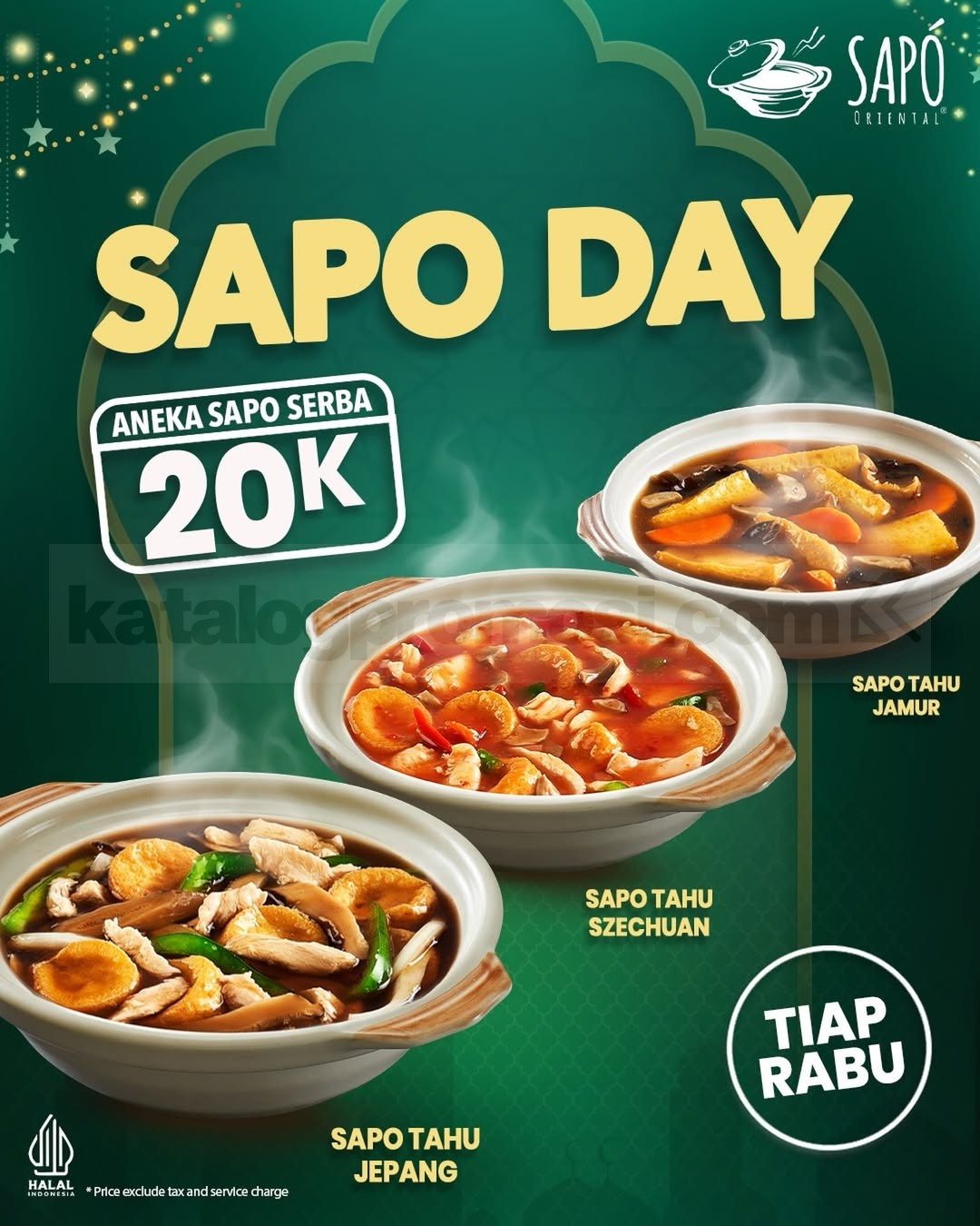 Promo Sapo Oriental Sapo Day aneka menu Rp. 20.000, nikmati menu pilihan tiap Rabu dengan harga hemat, berlaku mulai tanggal setiap Rabu, di seluruh outlet
