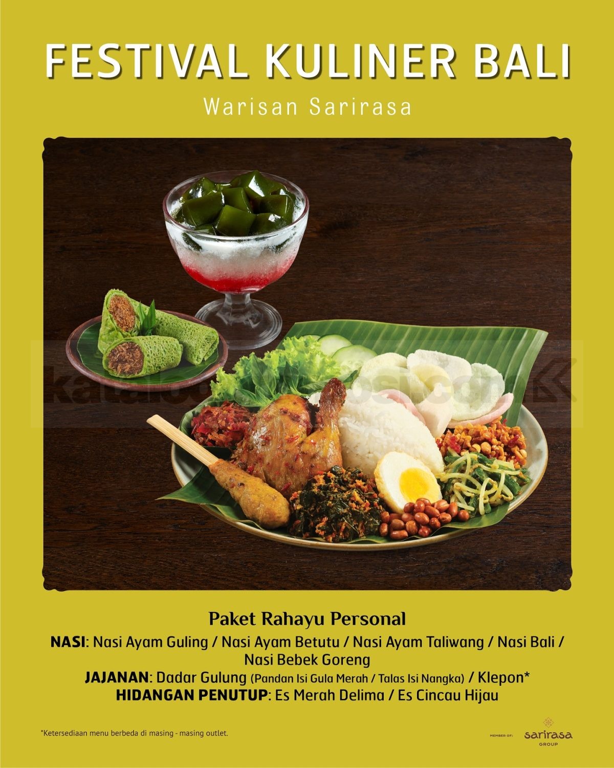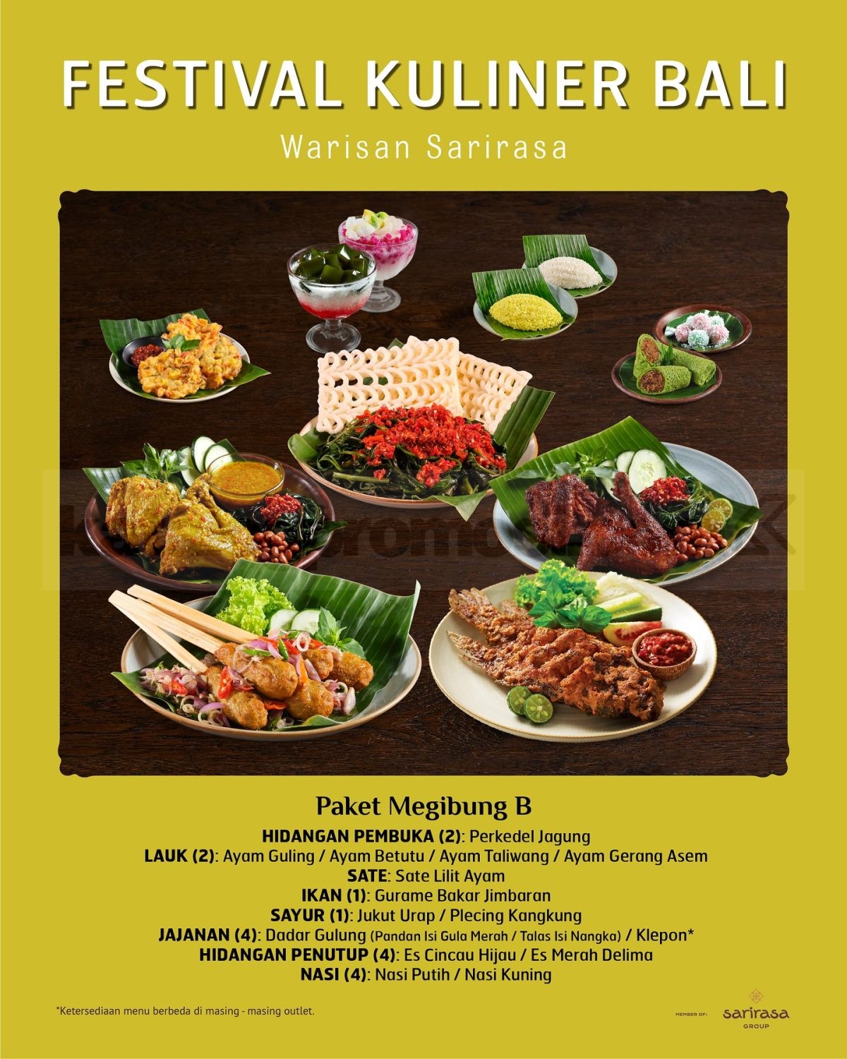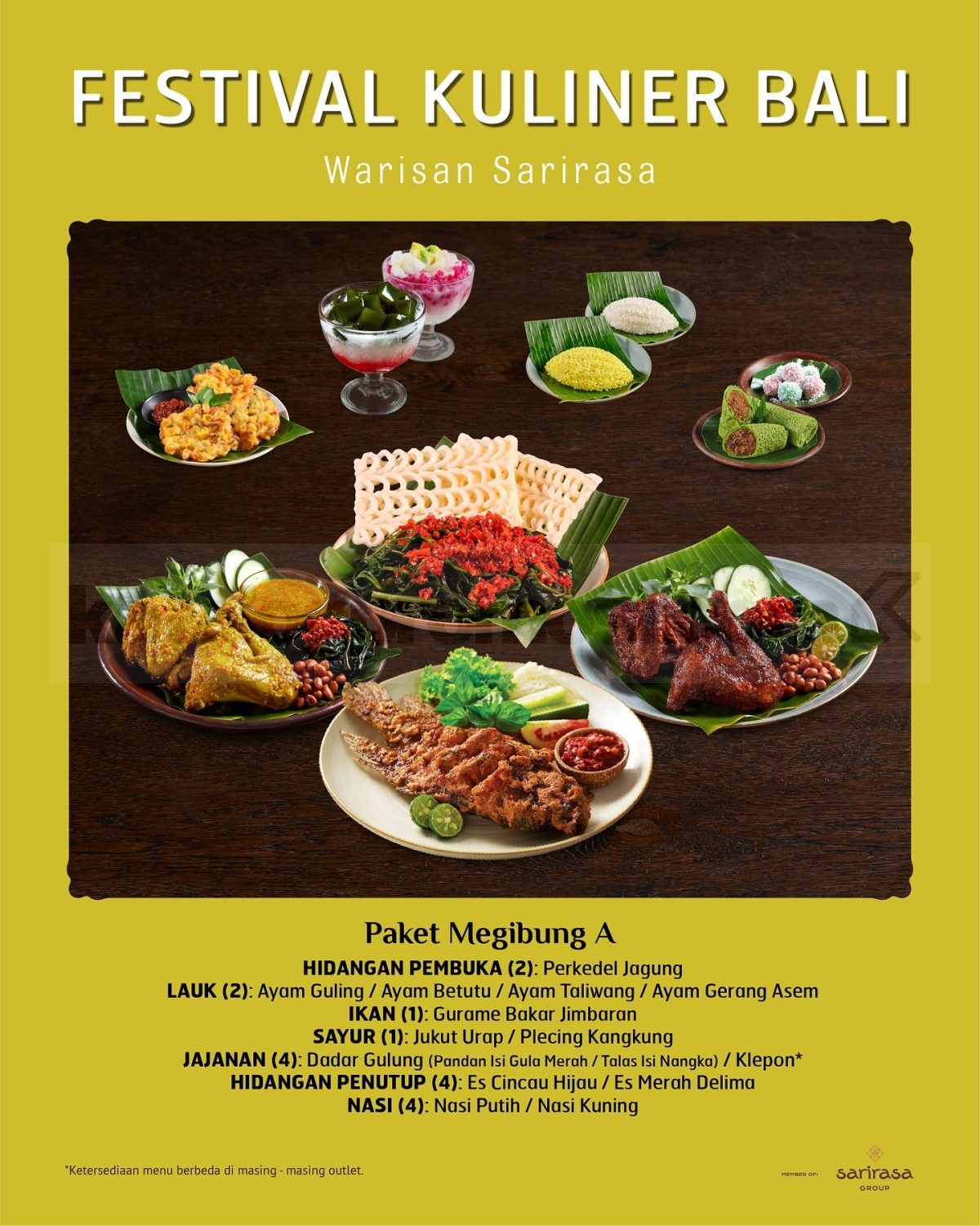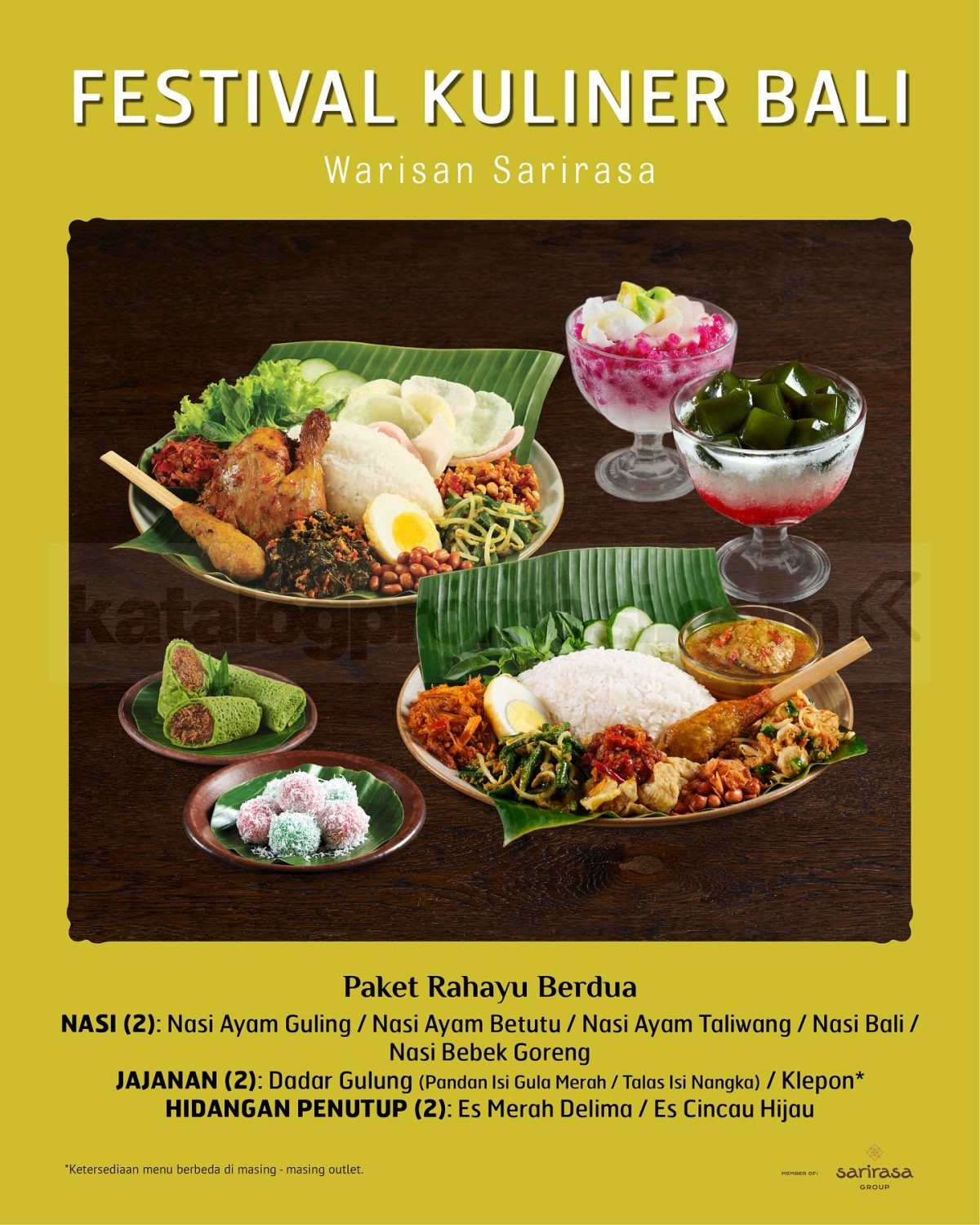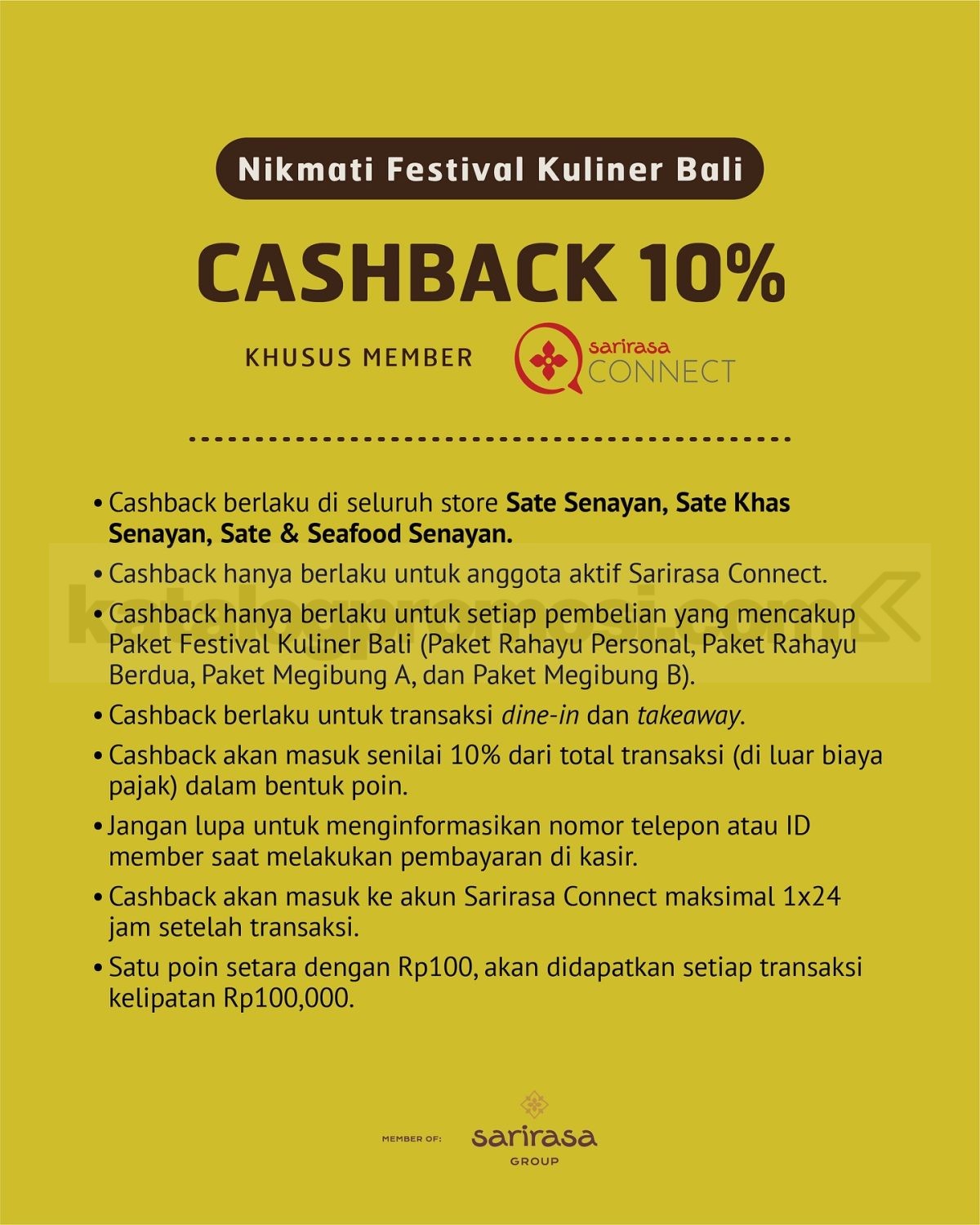 Ditambah promo spesial cashback 10% untuk pembelian paket Festival Kuliner Bali, hanya untuk member aktif Sarirasa Connect. Cashback diberikan dalam bentuk poin dan berlaku untuk dine-in & takeaway.