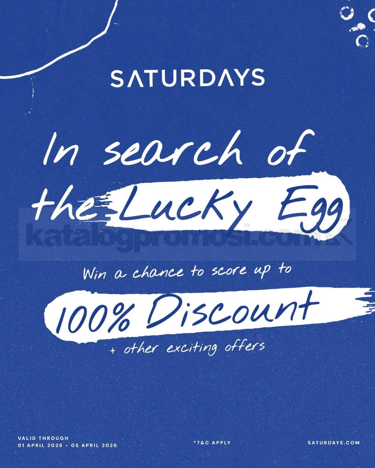 Jangan sampai ketinggalan Promo SATURDAYS Lucky Egg ini. Selain bisa upgrade gaya, kamu juga punya kesempatan besar mendapatkan diskon menarik bahkan sampai gratis. Langsung mampir ke outlet SATURDAYS terdekat dan rasakan sensasi belanja yang lebih seru!