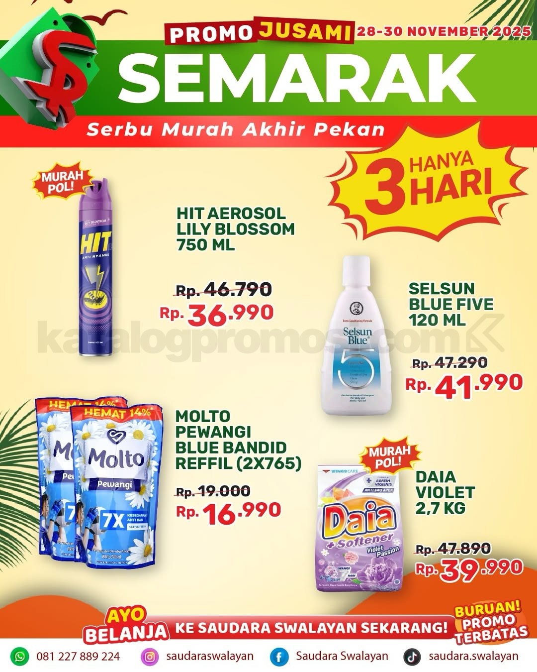 Promo Saudara Swalayan Jusami Semarak hadir lagi buat meriahkan akhir pekan kamu! Belanja kebutuhan rumah tangga jadi makin hemat cuma 3 hari, dari tanggal 28-30 November 2025. Yuk, serbu harga murahnya sebelum kehabisan!