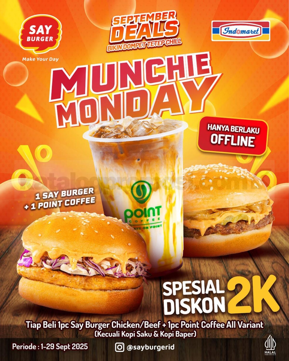 Promo SAY BURGER x POINT COFFEE Munchie Monday diskon Rp2.000 berlaku 1 – 29 September 2025 setiap Senin di Indomaret untuk pembelian burger + Point Coffee.