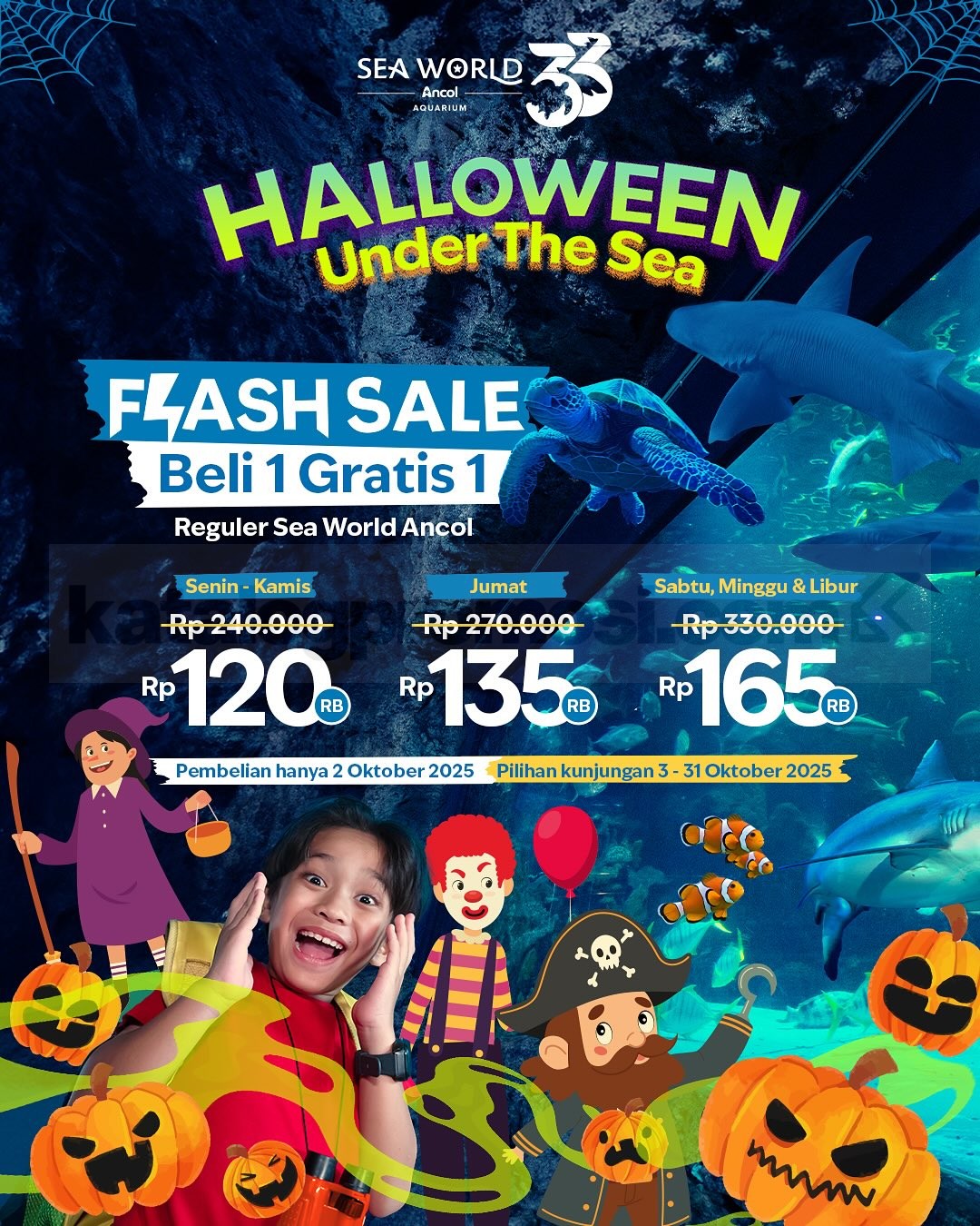 Promo Sea World Ancol Flash Sale Halloween Beli 1 Gratis 1 tiket reguler berlaku 2 Oktober 2025, kunjungan 3โ31 Oktober 2025.