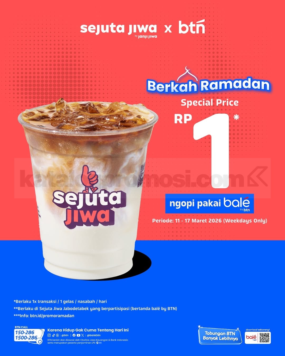 Promo Sejuta Jiwa x BTN Minuman Favorit Rp. 1 bayar pakai balé by BTN untuk 1 gelas per hari, berlaku mulai tanggal 11 Maret 2026 – 17 Maret 2026 di Sejuta Jiwa Jabodetabek tertentu.