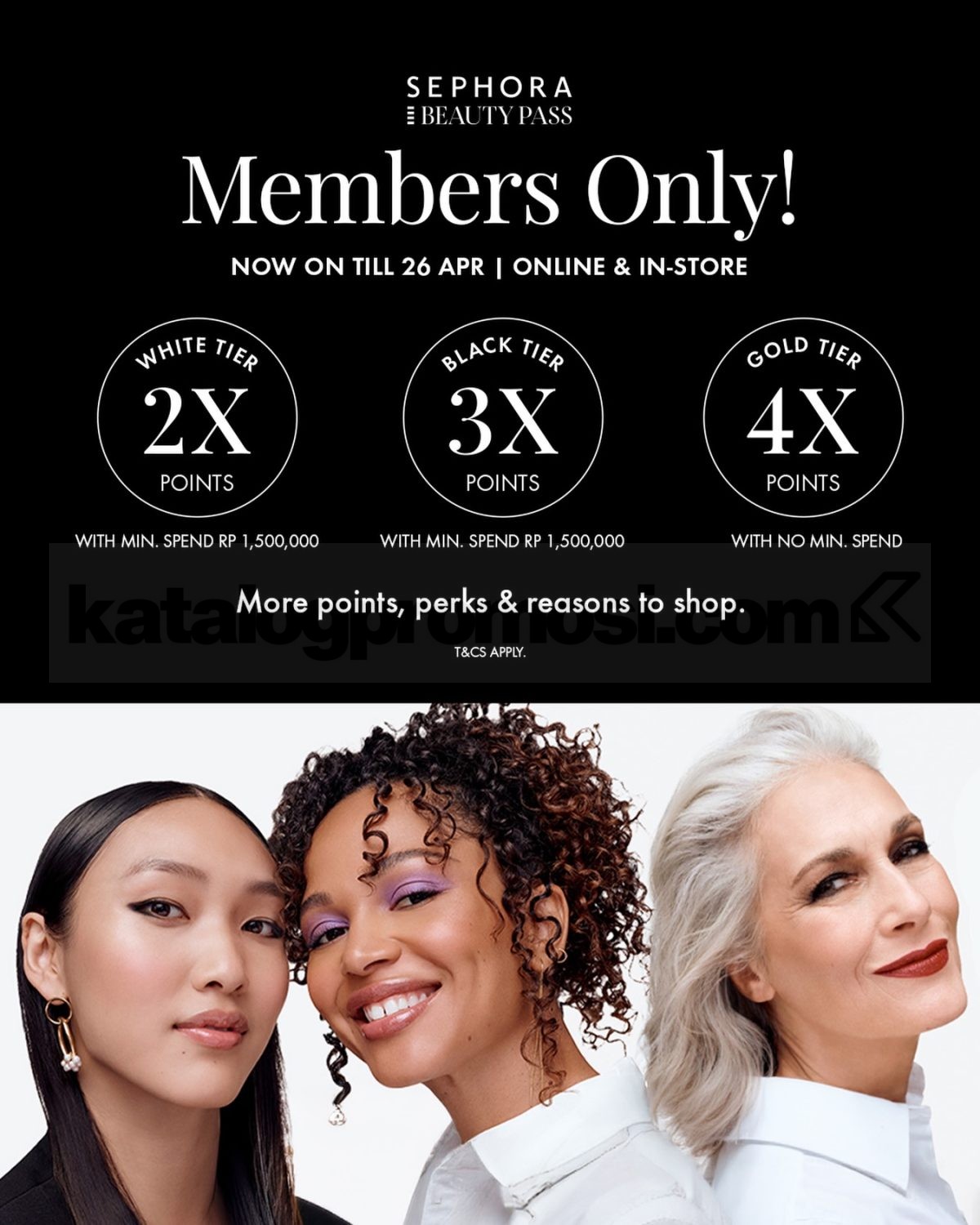 Promo Sephora Beauty Pass Members Only 4x Points periode hingga 26 April 2026 berlaku online dan in-store untuk anggota Beauty Pass sesuai tier membership dan minimum transaksi tertentu