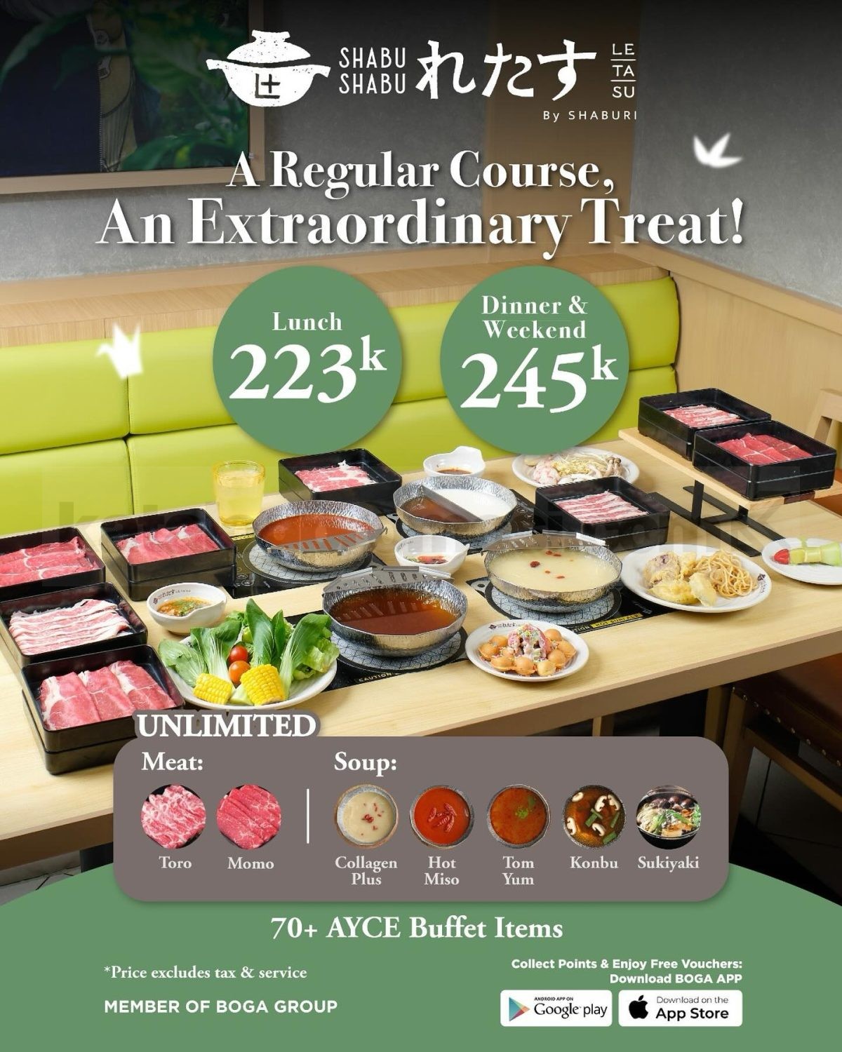Promo Shabu Shabu Letasu AYCE mulai Rp223.000 dengan pilihan daging & kuah premium, 70+ buffet item. Berlaku di seluruh outlet Jakarta.