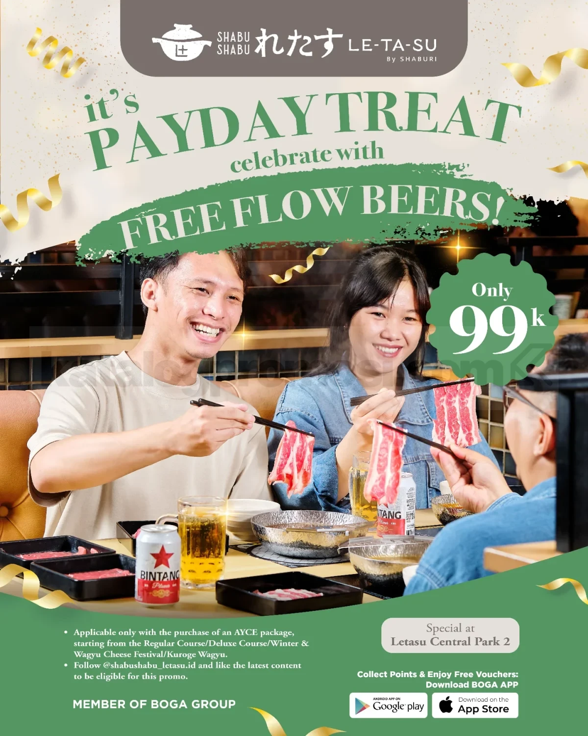 Promo SHABU SHABU LETASU Payday Treat Free Flow Beer 99K berlaku mulai tanggal 26 Januari 2026 selama promo tersedia, khusus dine in di Letasu Central Park 2.