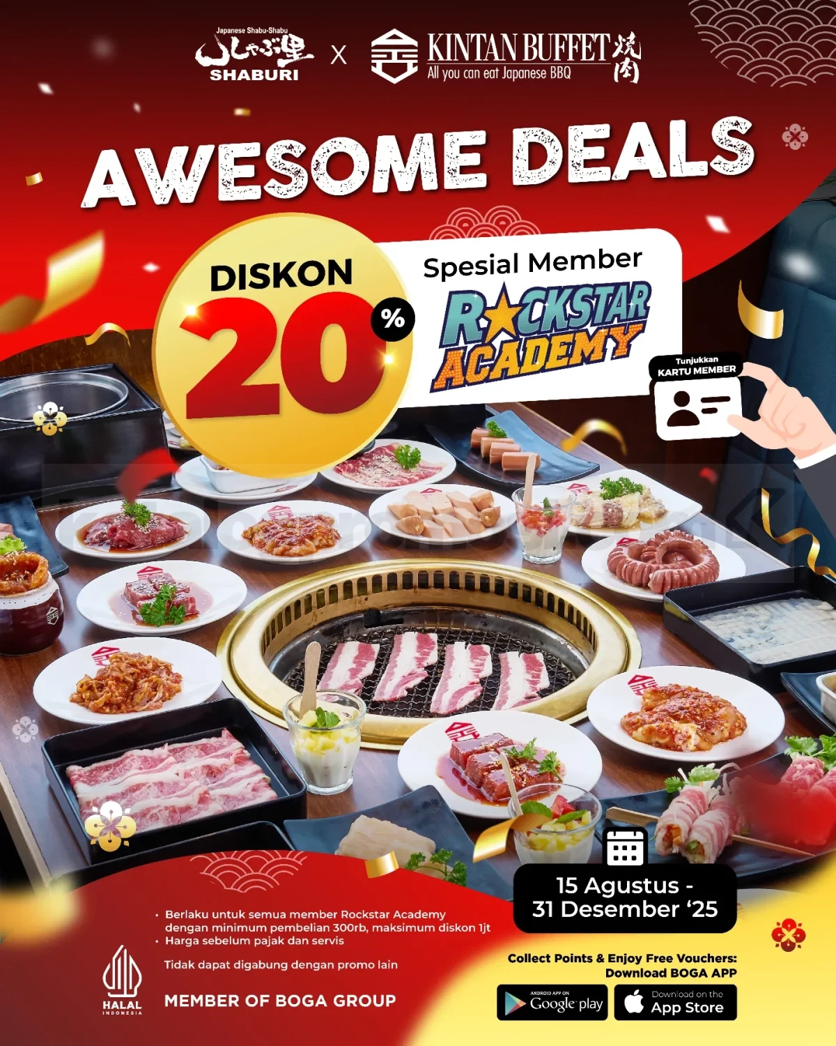 Promo Shaburi dan Kintan Buffet diskon 20% buat semua member Rockstar Academy. Berlaku di seluruh outlet mulai tanggal 15 Agustusβ31 Desember 2025 dengan minimum transaksi Rp300.000 dan potongan maksimal Rp1.000.000.