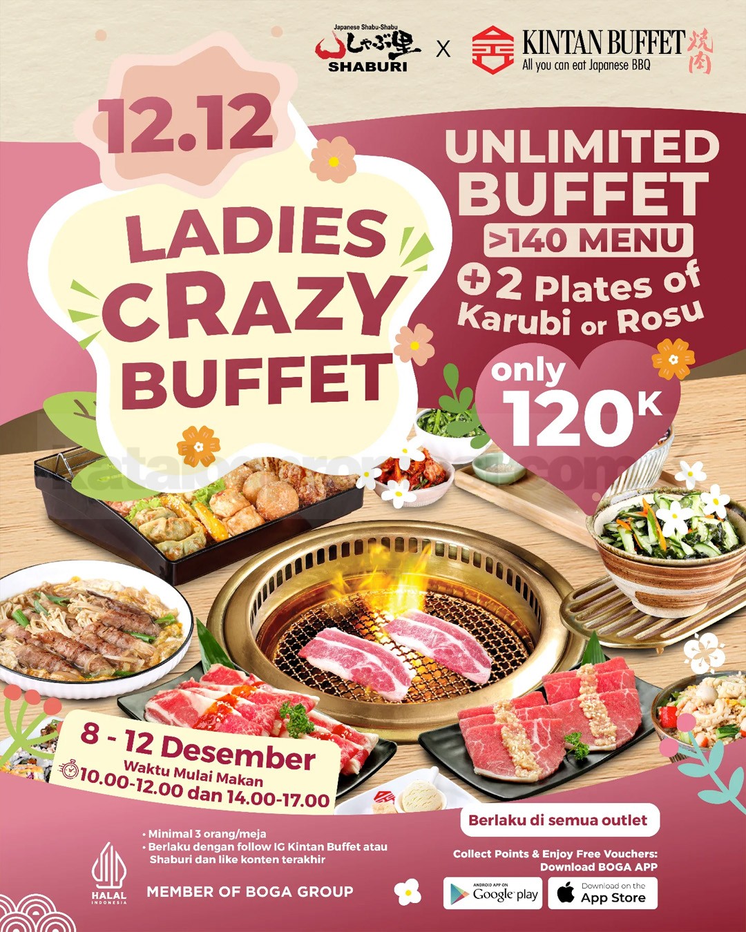 Promo Shaburi Kintan Buffet 12.12 Ladies Crazy Buffet Rp. 120 ribu dengan buffet >140 menu dan bonus daging, berlaku 8–12 Desember di semua outlet.
