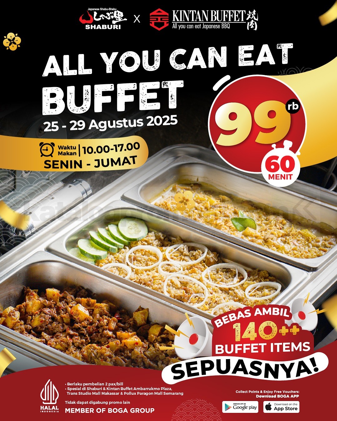 Jangan sampai kelewatan, mulai 25–29 Agustus 2025 kamu bisa makan puas di SHABURI & KINTAN BUFFET cuma Rp99.000 per orang untuk 60 menit! 😋🔥 Lebih dari 140 menu buffet bisa kamu ambil sepuasnya, cocok banget buat makan bareng teman atau keluarga.