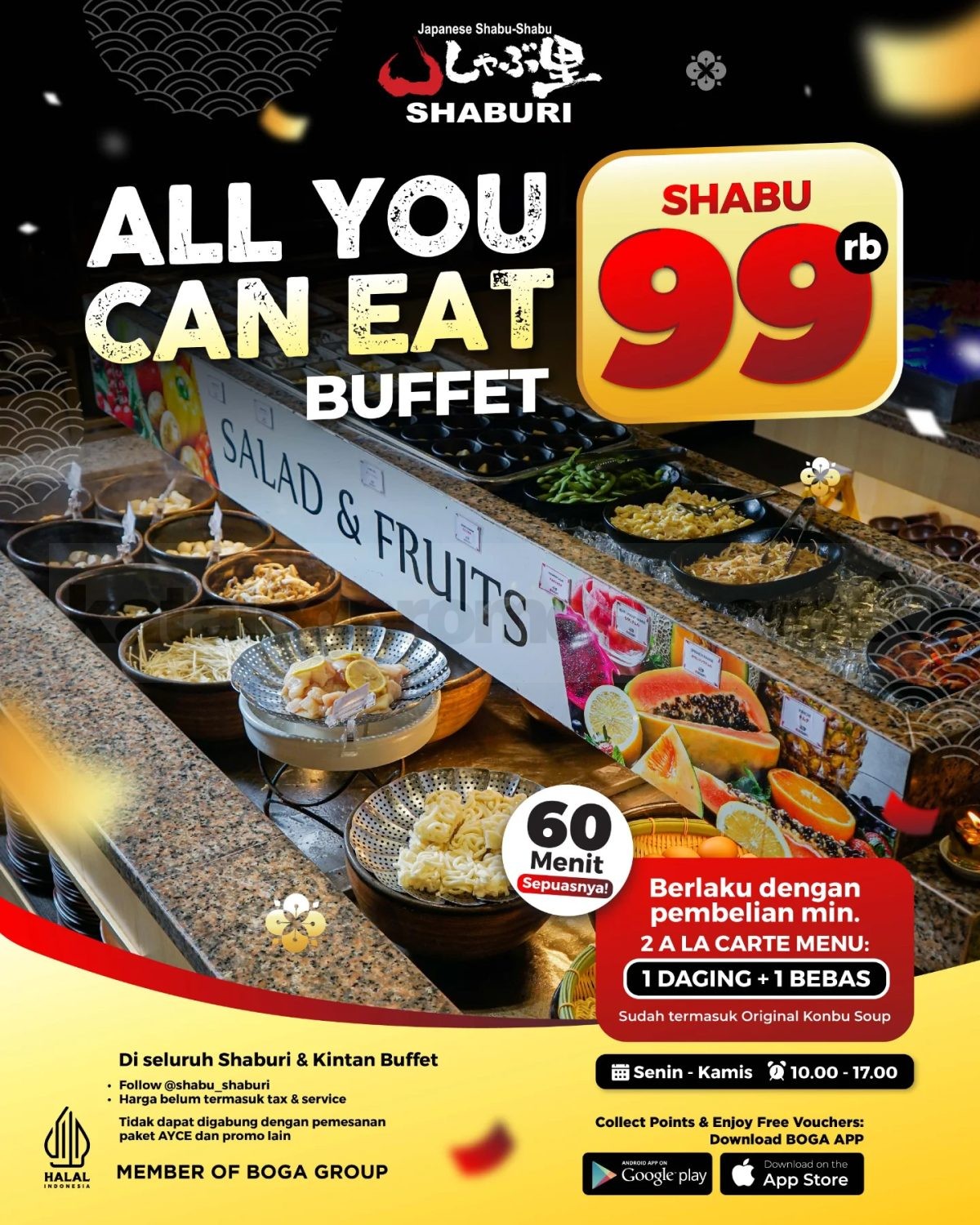 Berlaku di seluruh outlet SHABURI & KINTAN BUFFET di Indonesia selama promo berlangsung.