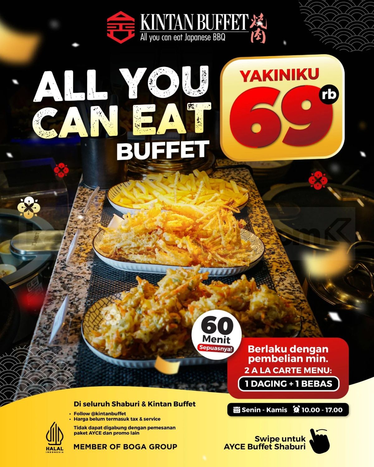 Kalau kamu pencinta daging panggang, KINTAN BUFFET siap manjain lidahmu dengan All You Can Eat Buffet Yakiniku seharga Rp. 69.000 per orang. Promo ini berlaku dengan pembelian minimal dua menu a la carte, yaitu satu menu daging dan satu menu bebas. Kamu bisa menikmati daging panggang sepuasnya selama 60 menit, cukup buat puas-puasin craving Yakiniku bareng teman, keluarga, atau pasangan. Promo ini berlaku setiap SeninβKamis pukul 10.00β17.00 di seluruh outlet Shaburi & Kintan Buffet. Harga belum termasuk pajak dan service, dan promo tidak dapat digabung dengan promo lain atau paket AYCE lainnya. Jangan lupa follow akun resmi @kintanbuffet biar selalu update promo serunya! π₯