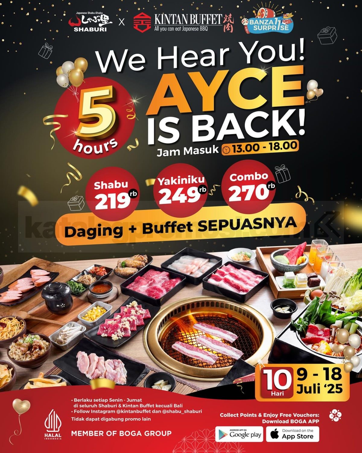 Kalau biasanya cuma dapet 90 menit, sekarang waktunya puas-puasin! Dalam rangka anniversary Shaburi & Kintan Buffet, kamu bisa makan sepuasnya selama 5 jam lewat promo spesial AYCE is Back!. Promo ini berlaku di seluruh outlet (kecuali Bali) dan hanya di jam masuk 13.00–18.00 setiap hari Senin sampai Jumat.