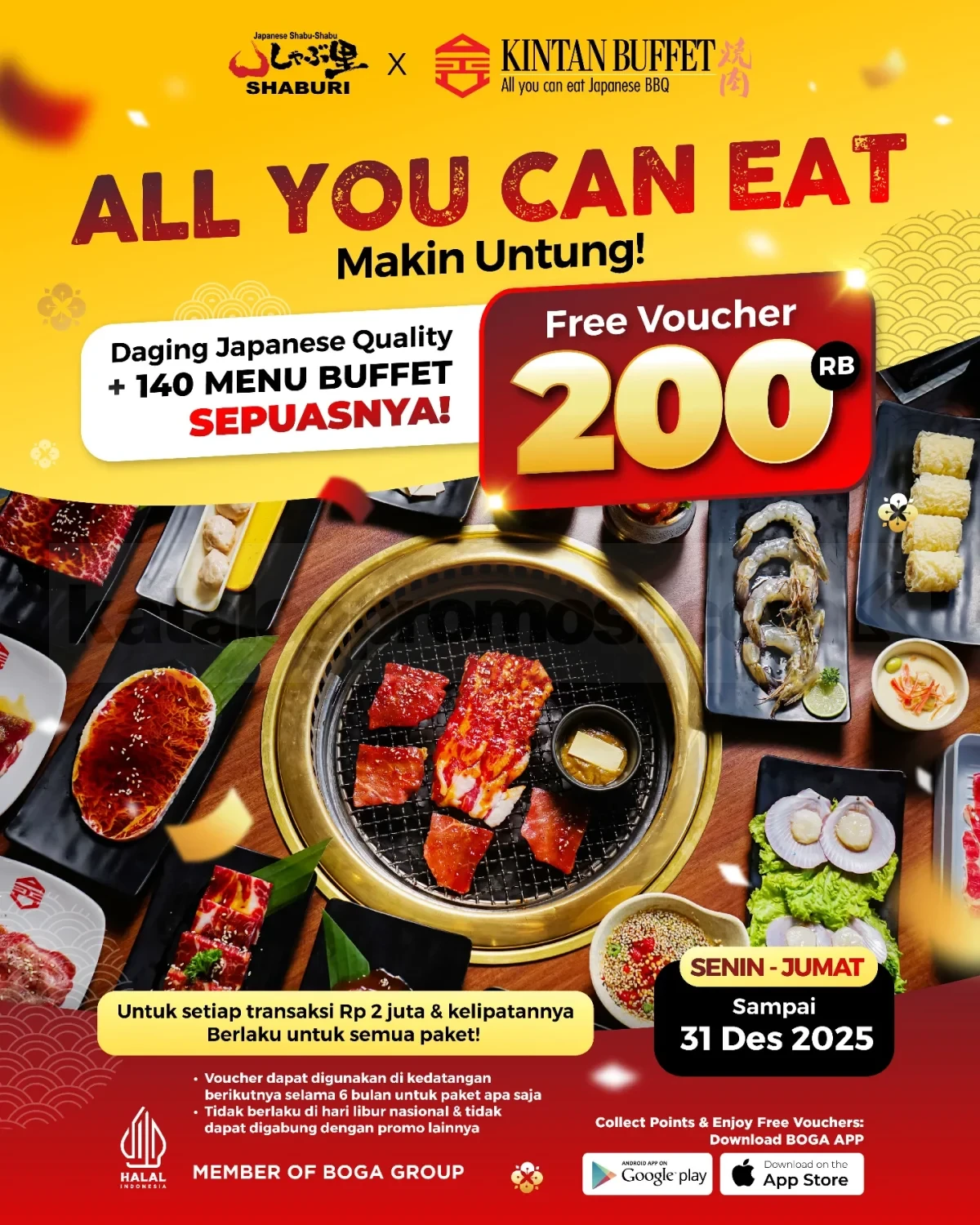 Promo Shaburi Kintan Buffet AYCE Free Voucher Rp. 200.000 untuk transaksi mulai Rp2 juta, bebas pilih paket, berlaku hingga 31 Desember 2025 di seluruh outlet.