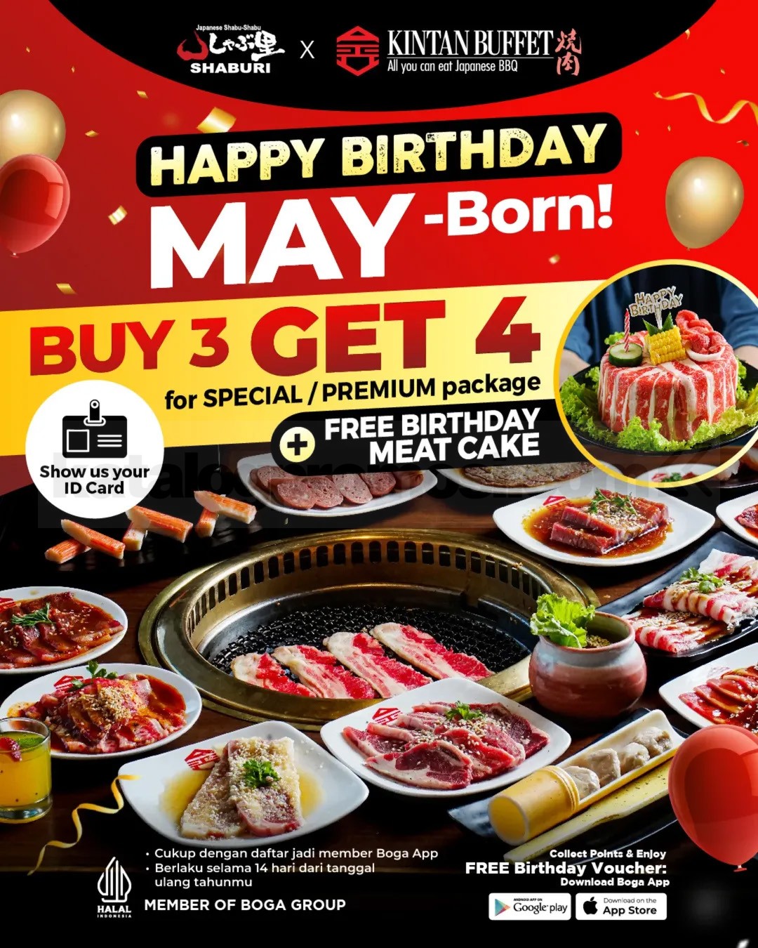 Promo Shaburi & Kintan Buffet September Birthday Treat dengan free Birthday Meat Cake dan Buy 3 Get 4 berlaku di seluruh outlet via Boga App.