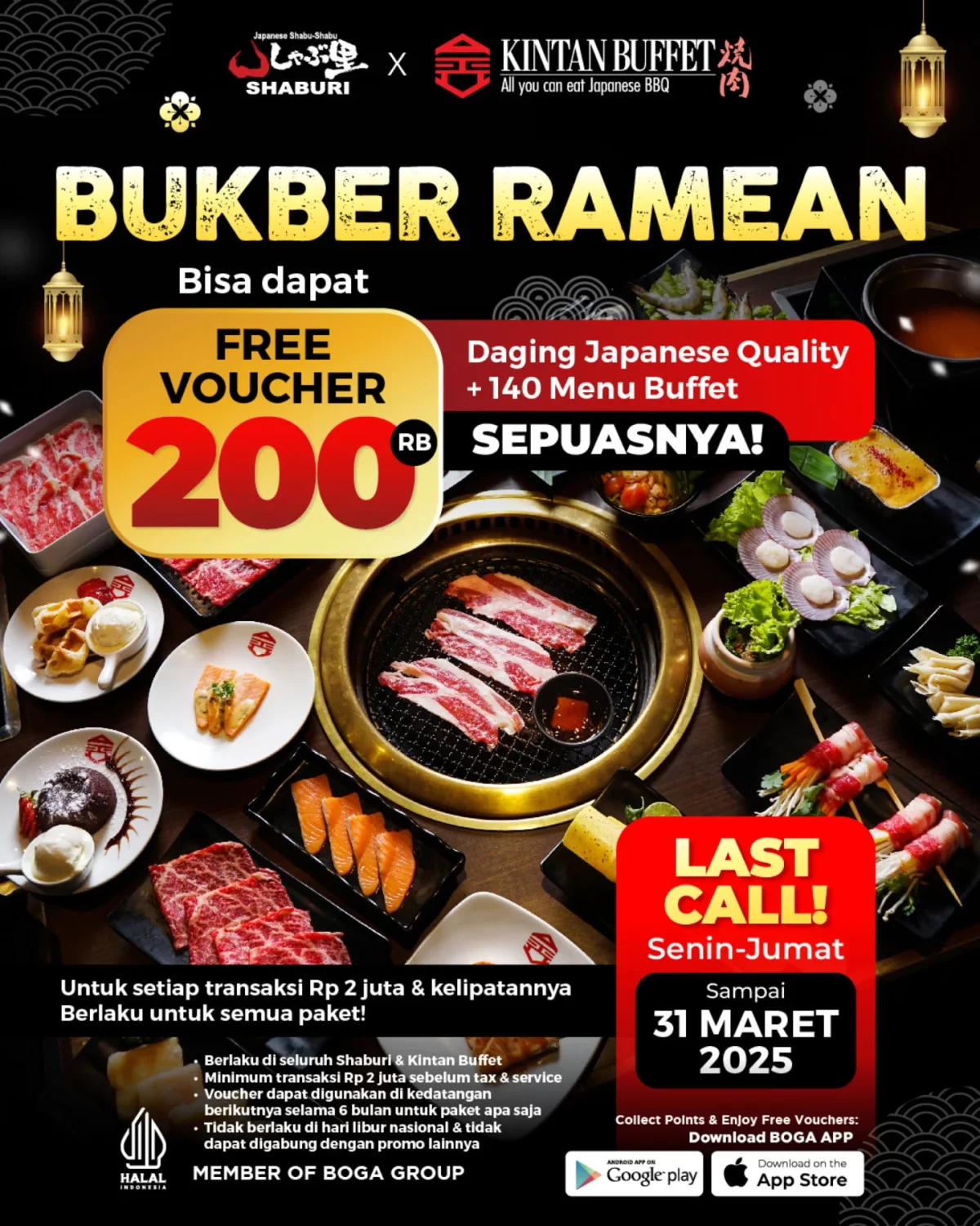 Promo Shaburi Kintan Buffet AYCE Free Voucher Rp. 200.000 untuk transaksi mulai Rp2 juta, bebas pilih paket, berlaku hingga 31 Desember 2025 di seluruh outlet.
