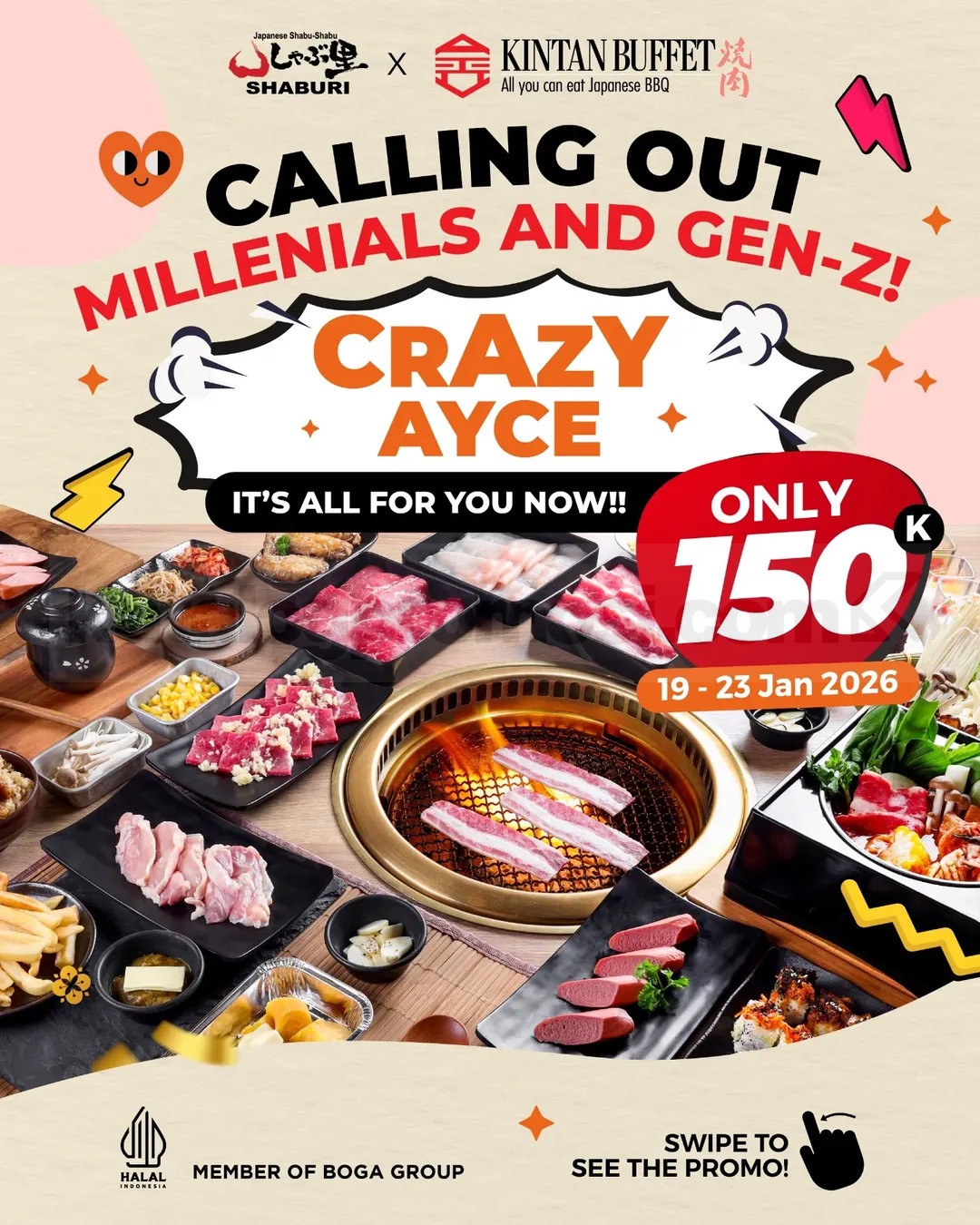 Promo SHABURI KINTAN BUFFET Crazy AYCE Rp. 150.000 berlaku 19 – 23 Januari 2026 buat Millennials dan Gen-Z kelahiran 1981–2012, makan sepuasnya 60 menit di jam tertentu di seluruh outlet.