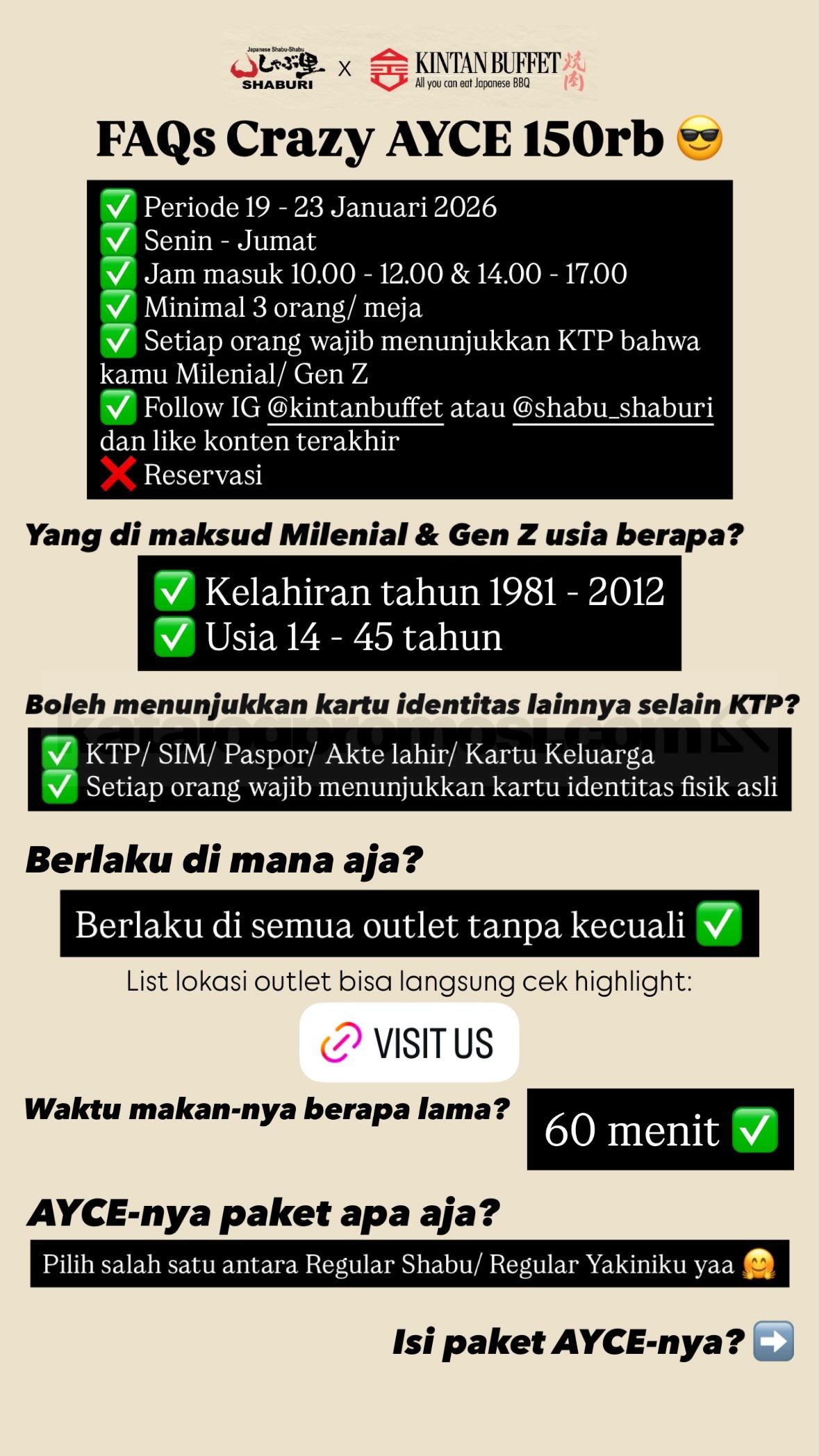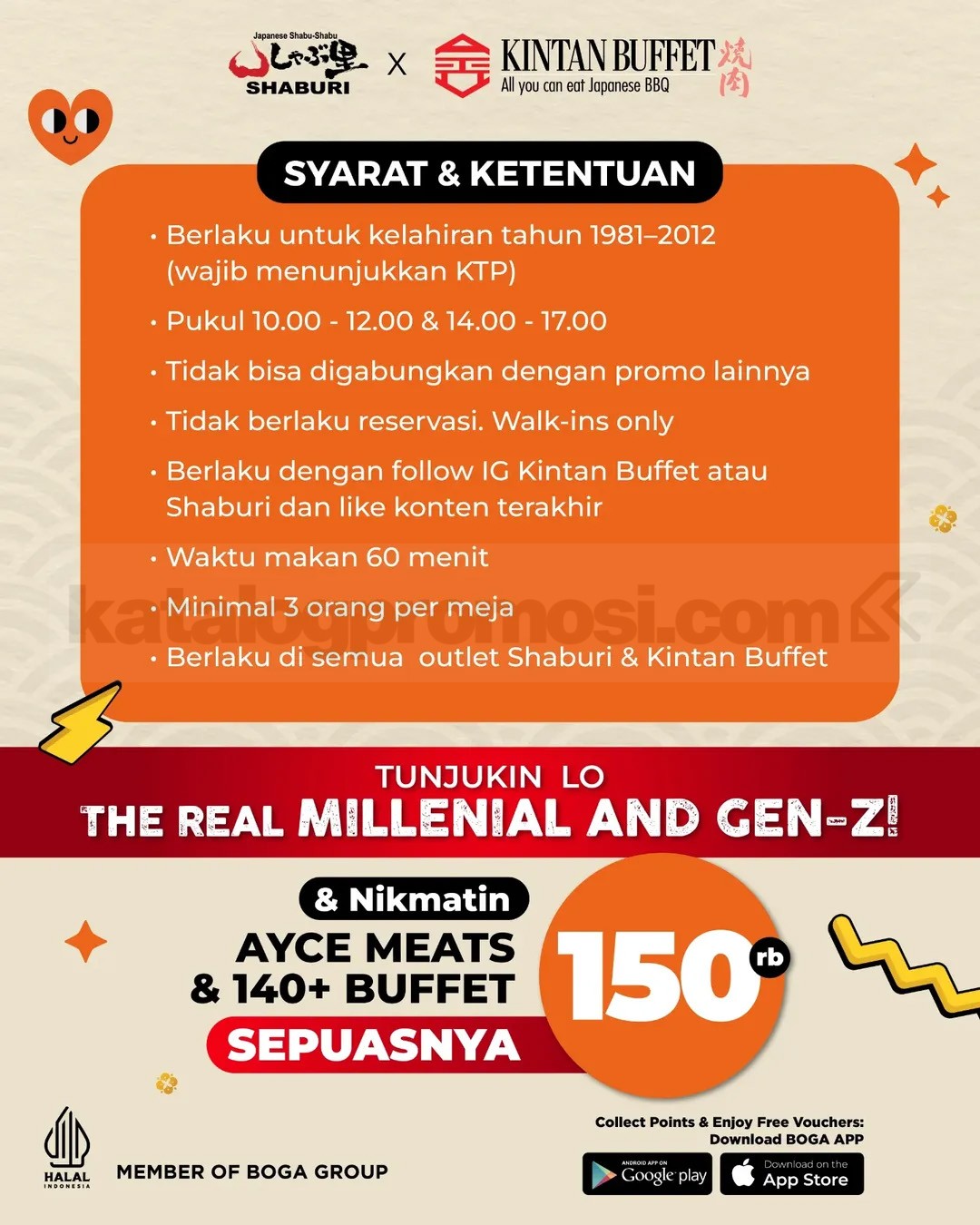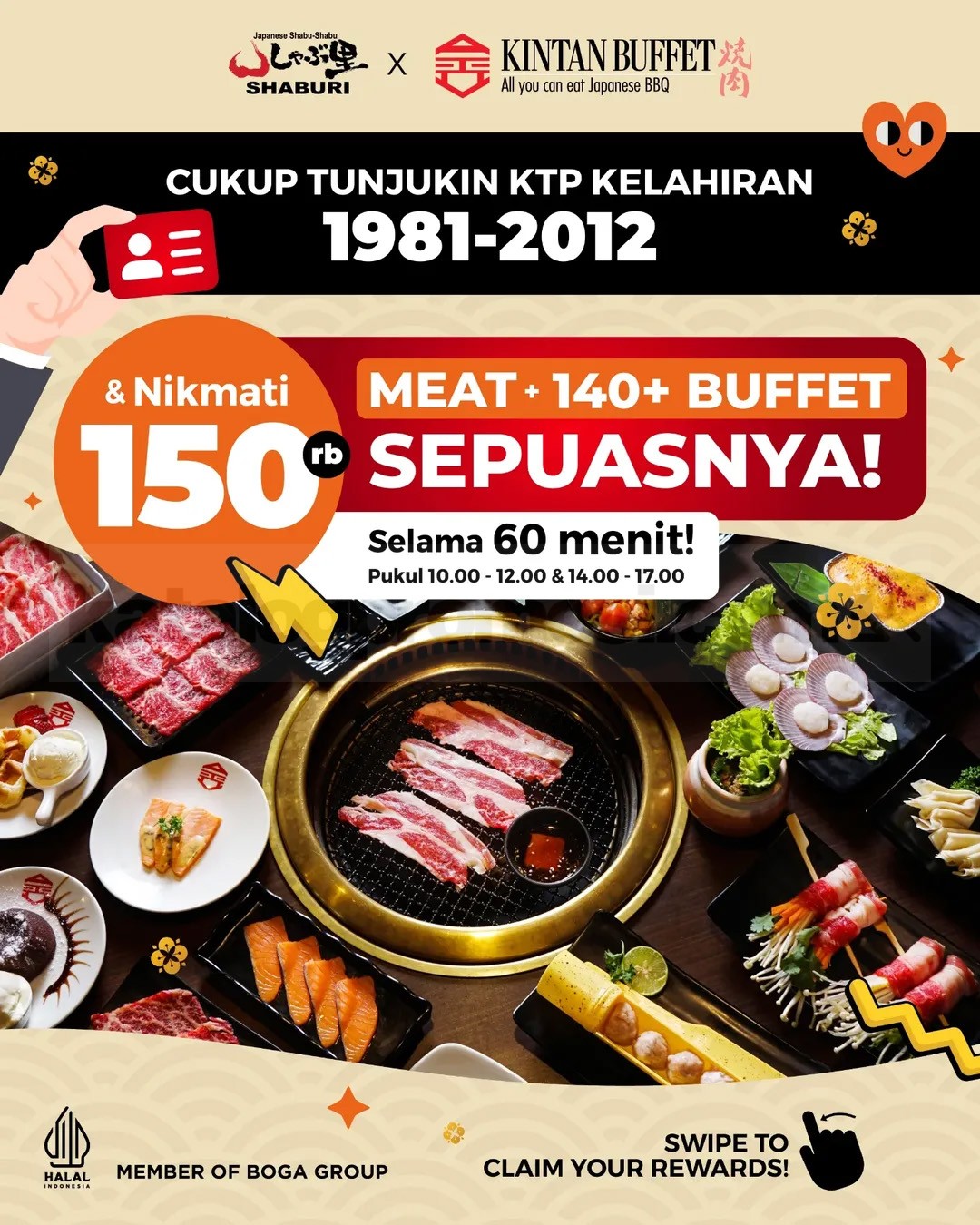 Promo ini berlaku khusus untuk pelanggan dengan tahun kelahiran 1981 sampai 2012. Selama periode promo, cukup datang ke outlet SHABURI atau KINTAN BUFFET, tunjukkan KTP sebagai identitas usia, dan kamu bisa langsung masuk ke sesi makan all you can eat selama 60 menit.