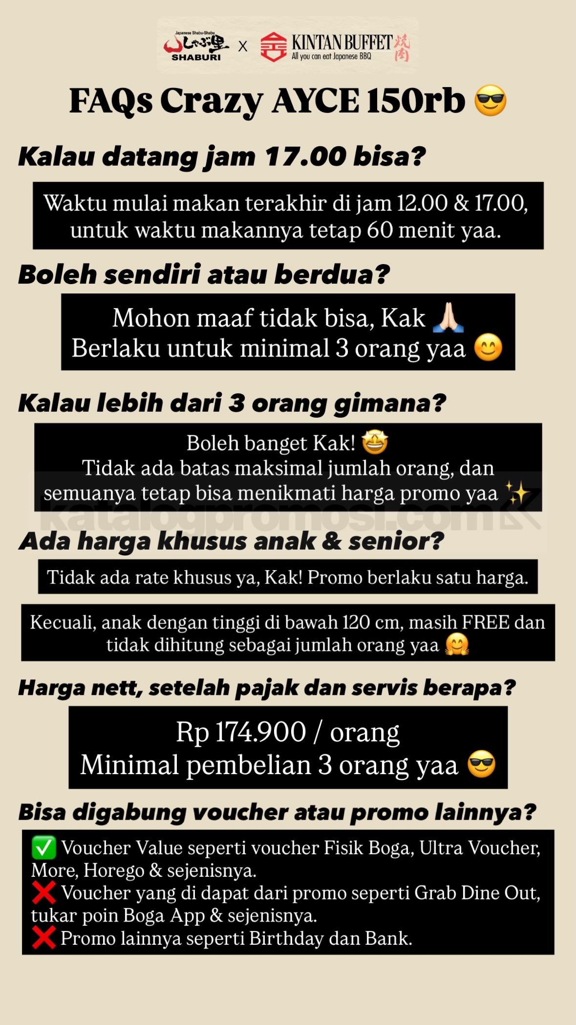 Kalau usia kamu masuk dan jamnya cocok, promo Crazy AYCE ini layak banget dicoba. Harga satu, pilihan menu banyak, dan konsep makan puas yang memang paling enak dinikmati rame-rame di SHABURI dan KINTAN BUFFET.