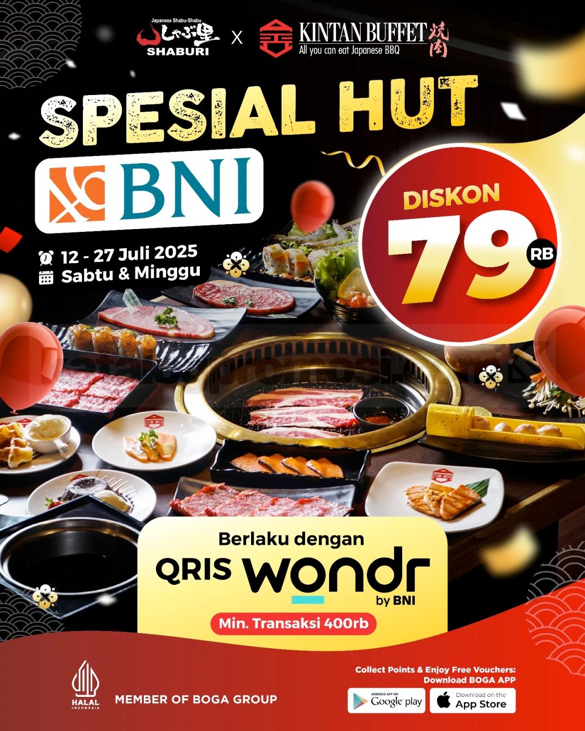 Promo Shaburi Kintan Buffet HUT BNI 79! Diskon Rp79.000 tiap Sabtu & Minggu mulai tanggal 12–27 Juli 2025, bayar pakai QRIS wondr by BNI di seluruh outlet.
