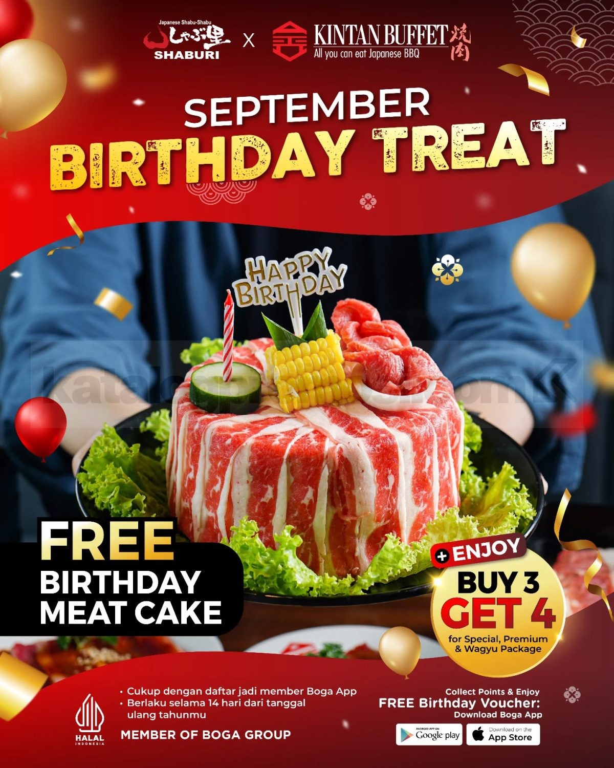 Promo Shaburi & Kintan Buffet September Birthday Treat dengan free Birthday Meat Cake dan Buy 3 Get 4 berlaku di seluruh outlet via Boga App.