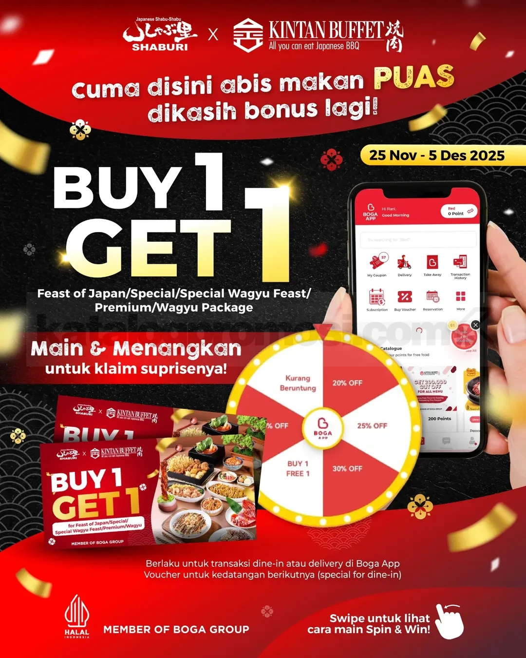 Promo Shaburi Kintan Buffet Spin & Win Buy 1 Get 1 Free berlangsung 25 November–5 Desember 2025 untuk dine-in dan delivery via Boga App.