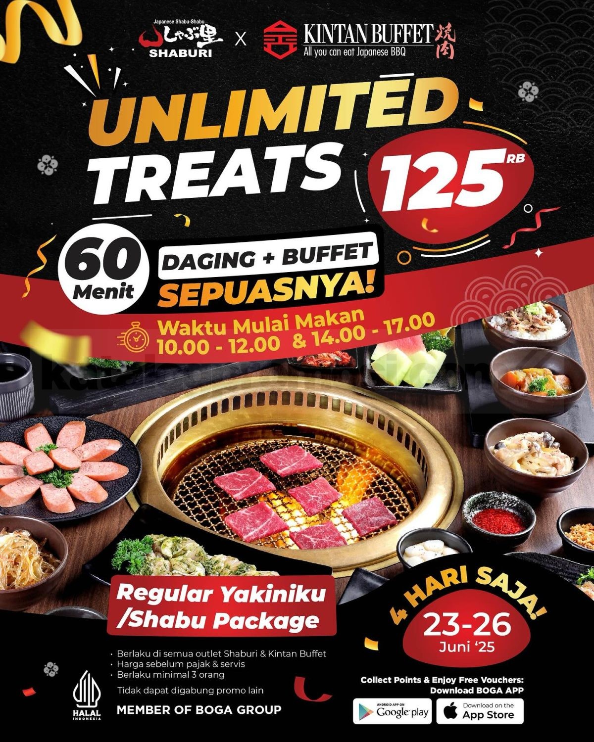 Promo Shaburi & Kintan Buffet Unlimited Treats kembali lagi! Makan sepuasnya cuma Rp125.000 per orang selama 60 menit, daging + buffet puas-puasin, cuma 4 hari, 23–26 Juni 2025 di semua outlet Shaburi & Kintan Buffet.