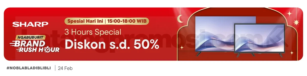 Promo Sharp Ngabuburit Brand Rush Hour diskon hingga 50% untuk produk elektronik impian dengan checkout jam 15.00 WIB berlaku 24 Februari eksklusif di Blibli.