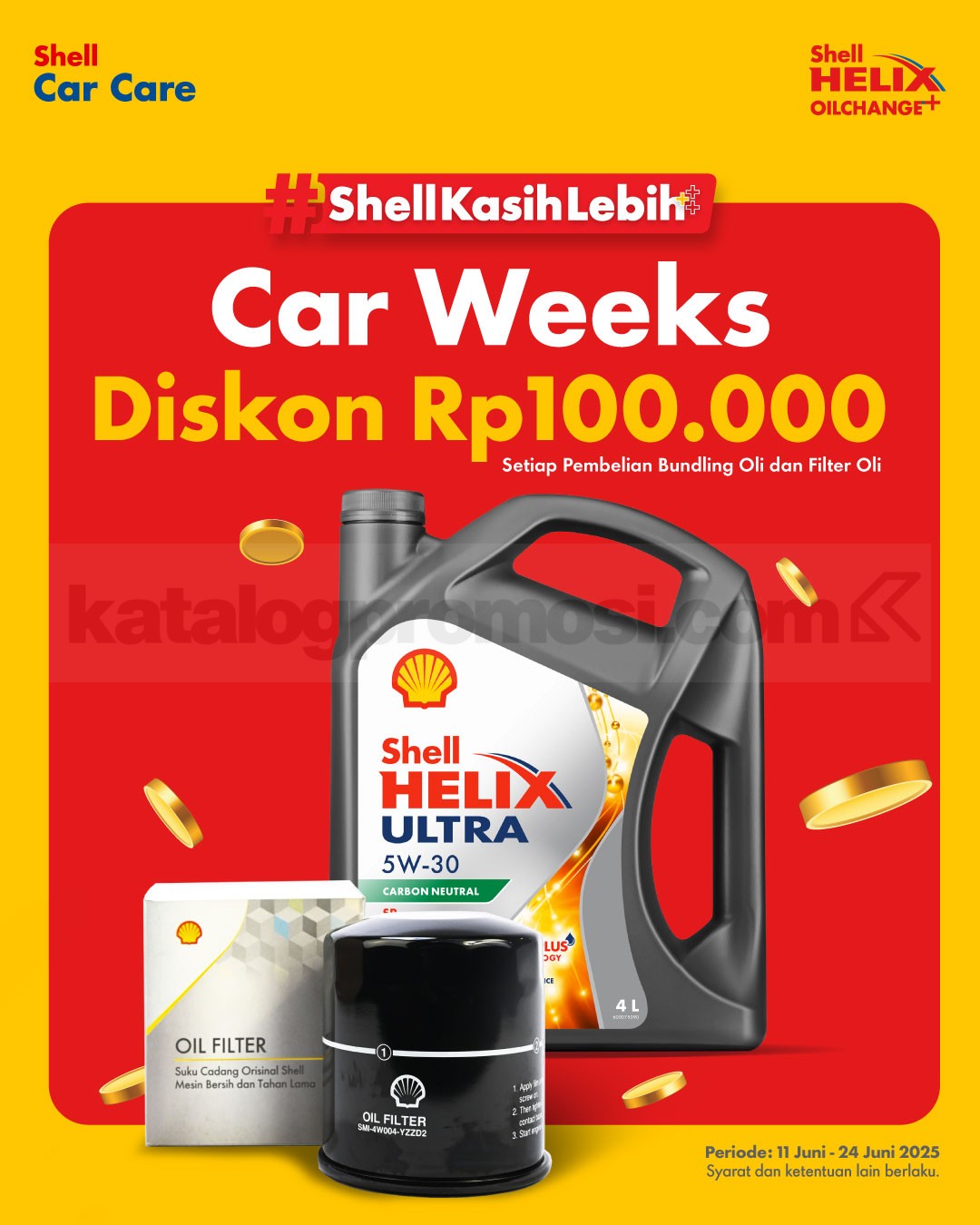Promo Shell Helix Bundling Oil Filter diskon Rp100.000 berlaku 11–24 Juni 2025 di bengkel SPBU Shell tertentu. Minimal beli oli 4 liter dan 1 Oil Filter Shell Car Care.
