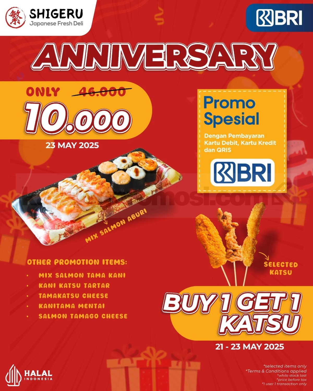 Promo Shigeru Anniversary Sushi cuma Rp10.000 dan beli 1 gratis 1 Katsu untuk pengguna BRI. Berlaku 21–23 Mei 2025, ada juga kompetisi hadiah Rp1,5 juta!