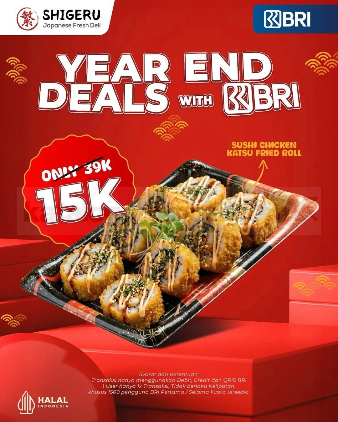 Promo Shigeru BRI Year End Deals Sushi Roll Rp. 15.000 berlaku 30 – 31 Desember 2025 khusus pembayaran menggunakan BRI dengan kuota terbatas.