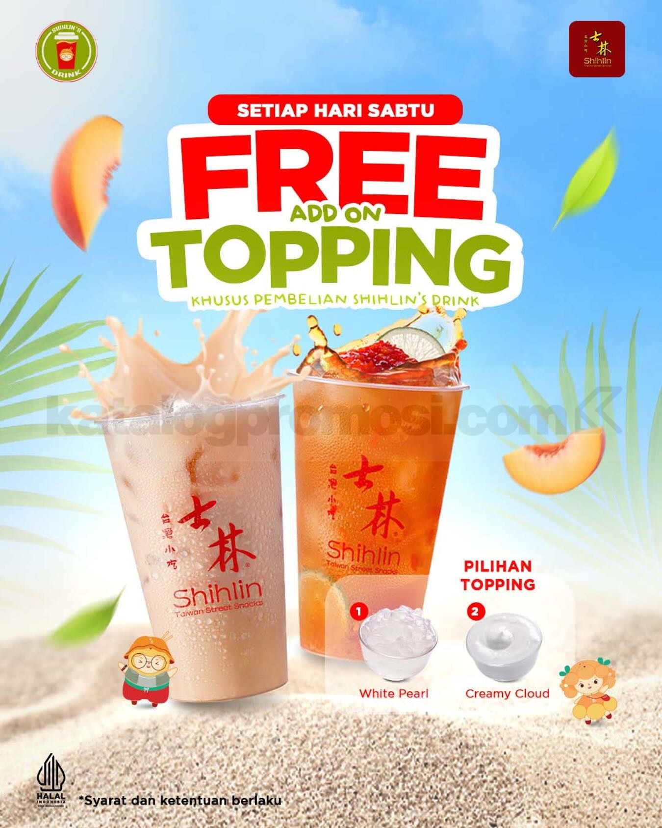 Promo Shihlin Free Add On Topping dapat topping gratis untuk pembelian Shihlin’s Drink, berlaku setiap Sabtu mulai 6 September 2025 di outlet tertentu.