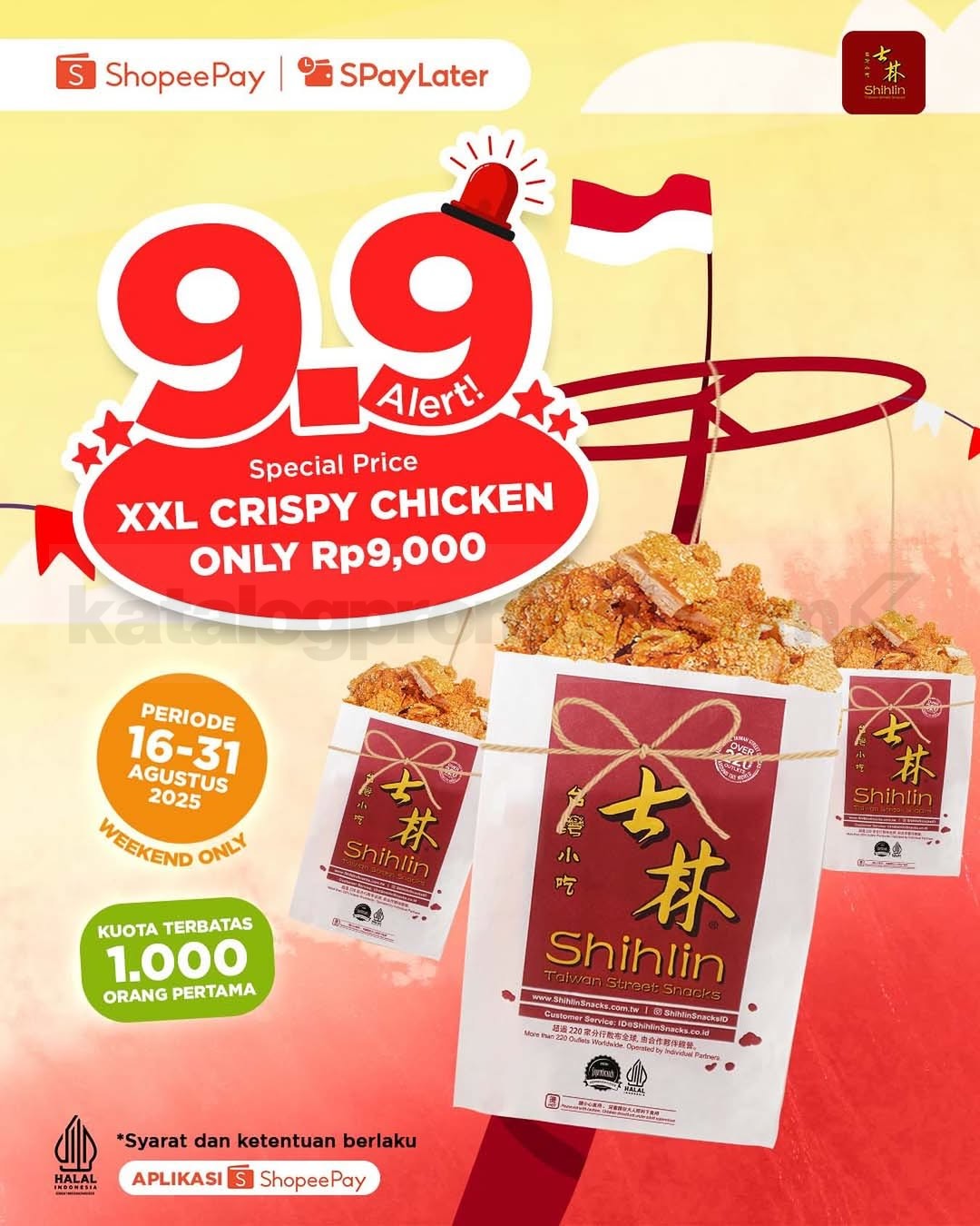 Promo Spesial 9.9 Shihlin XXL Crispy Chicken cuma Rp 9.000! Berlaku mulai 16–31 Agustus 2025, bayar pakai ShopeePay/SPayLater.