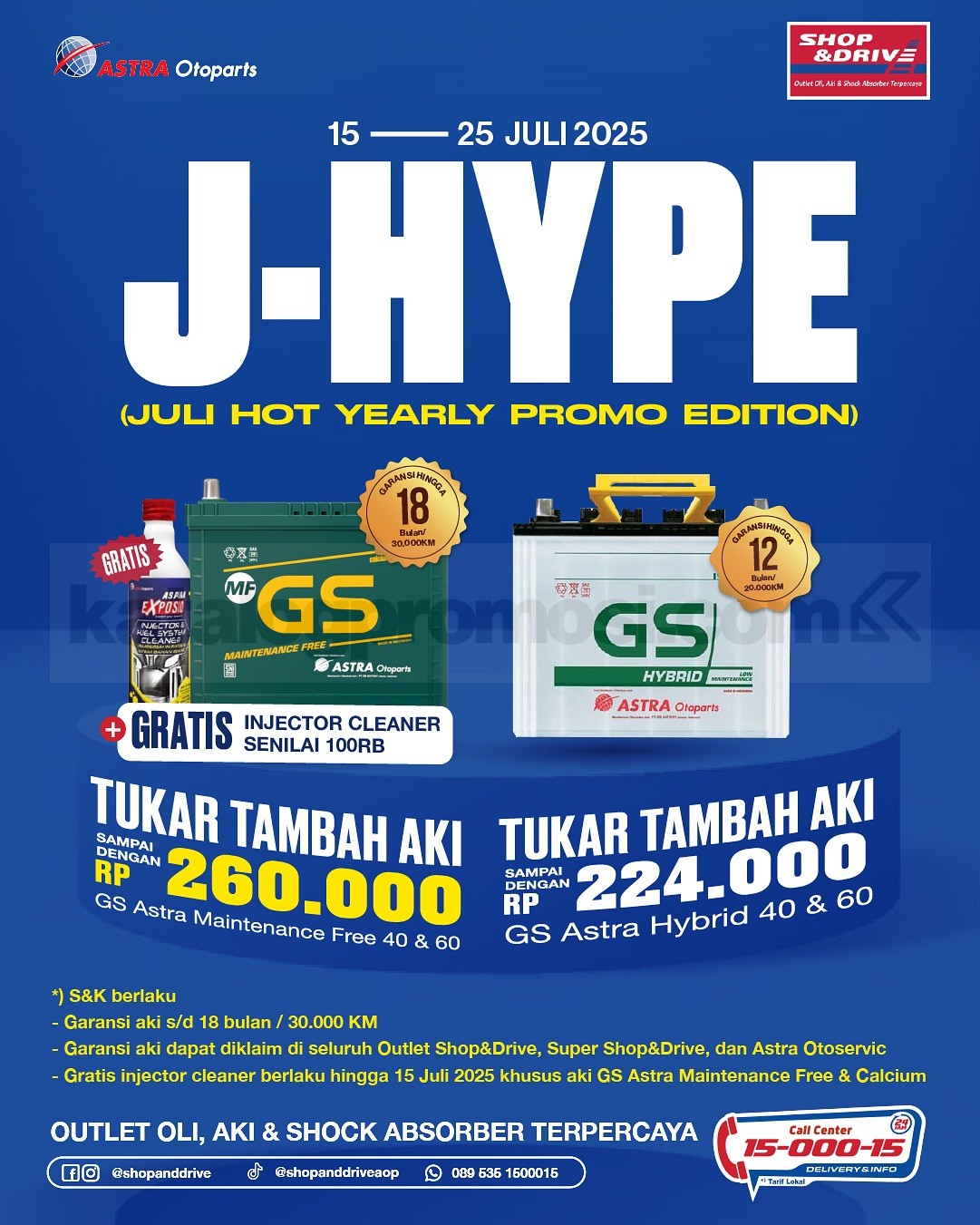 Promo Shop & Drive J-HYPE 15–25 Juli 2025! Tukar tambah aki GS Astra hingga Rp260.000 dan dapat gratis injector cleaner di outlet Shop & Drive seluruh Indonesia