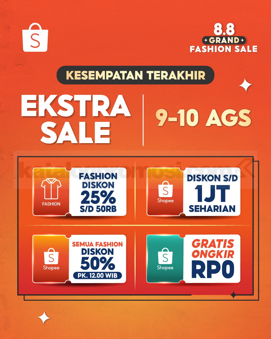 Kesempatan terakhir belanja hemat di Shopee 8.8 Grand Fashion Sale – Ekstra Sale! Selama dua hari, mulai tanggal 9–10 Agustus 2025, kamu bisa nikmati beragam promo fashion spesial dan gratis ongkir yang bikin belanja makin hemat.