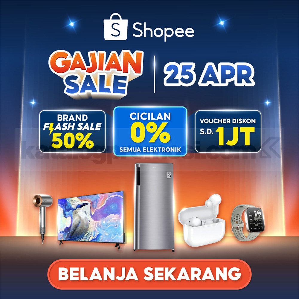 Promo Shopee Gajian Sale cicilan 0% semua elektronik diskon 50% + voucher Rp. 1.000.000 berlaku 20 April 2026 – 25 April 2026.
