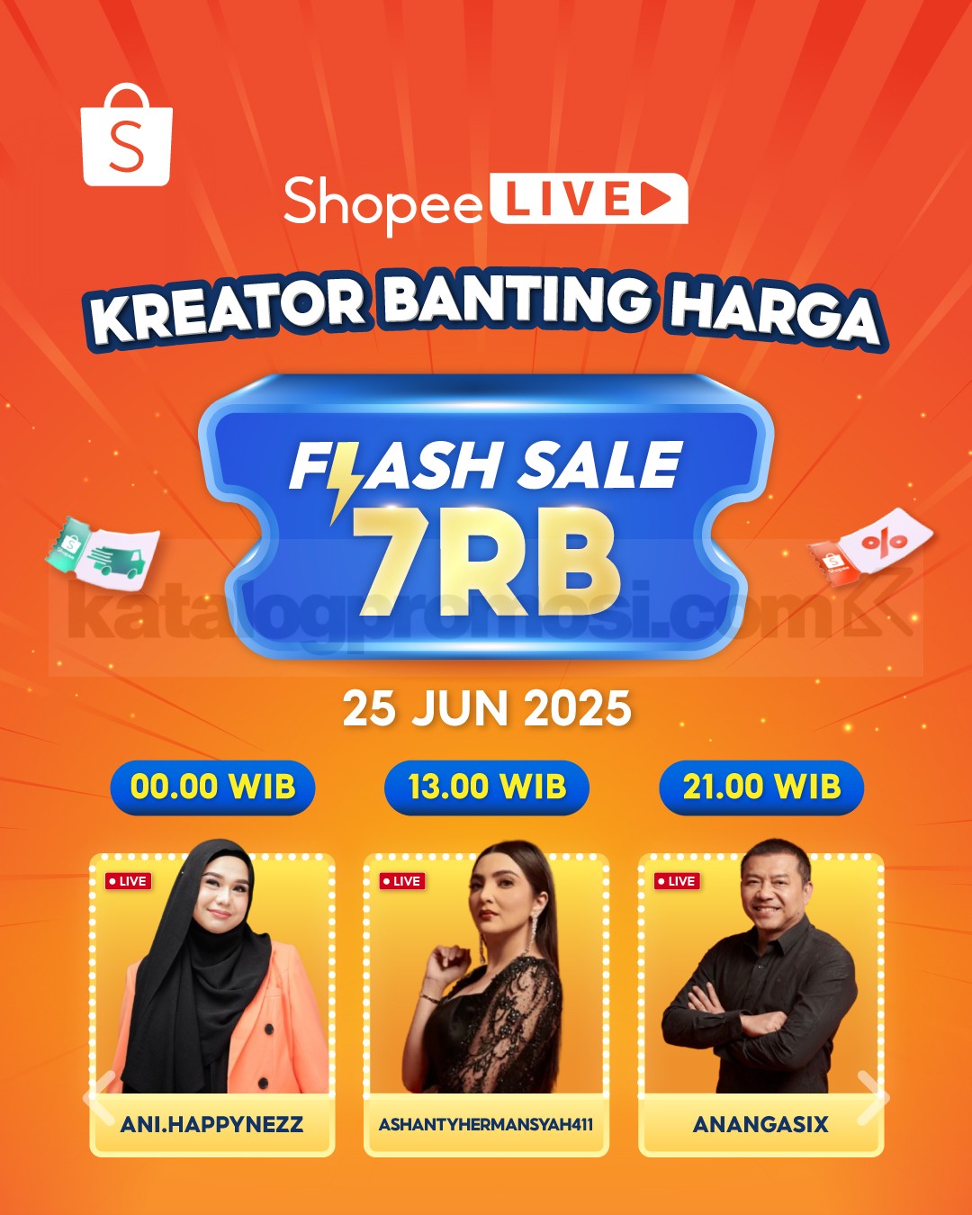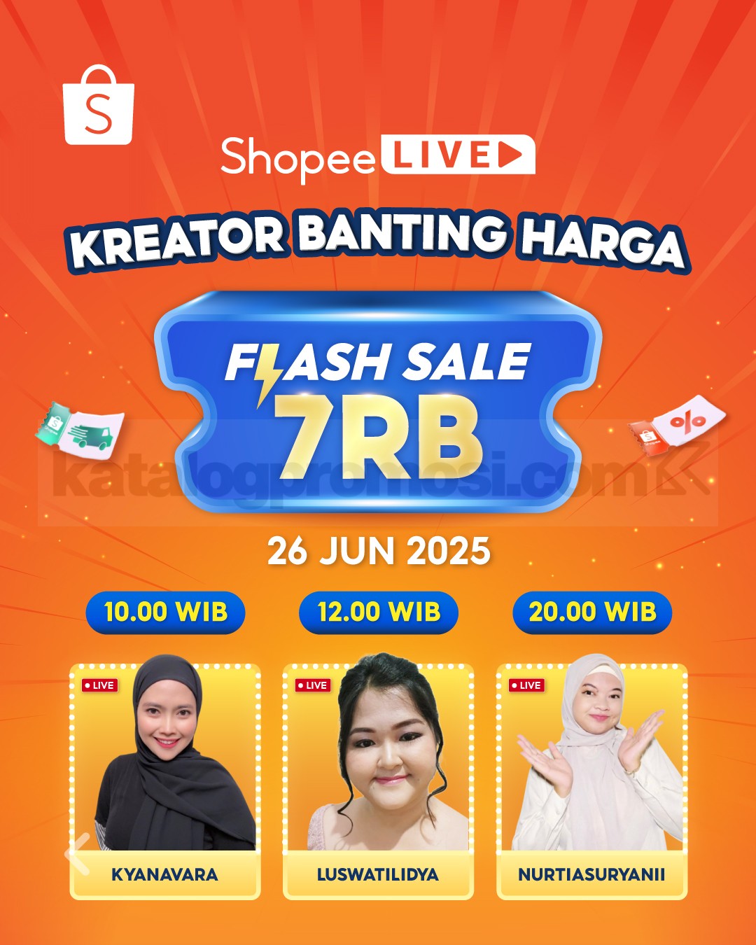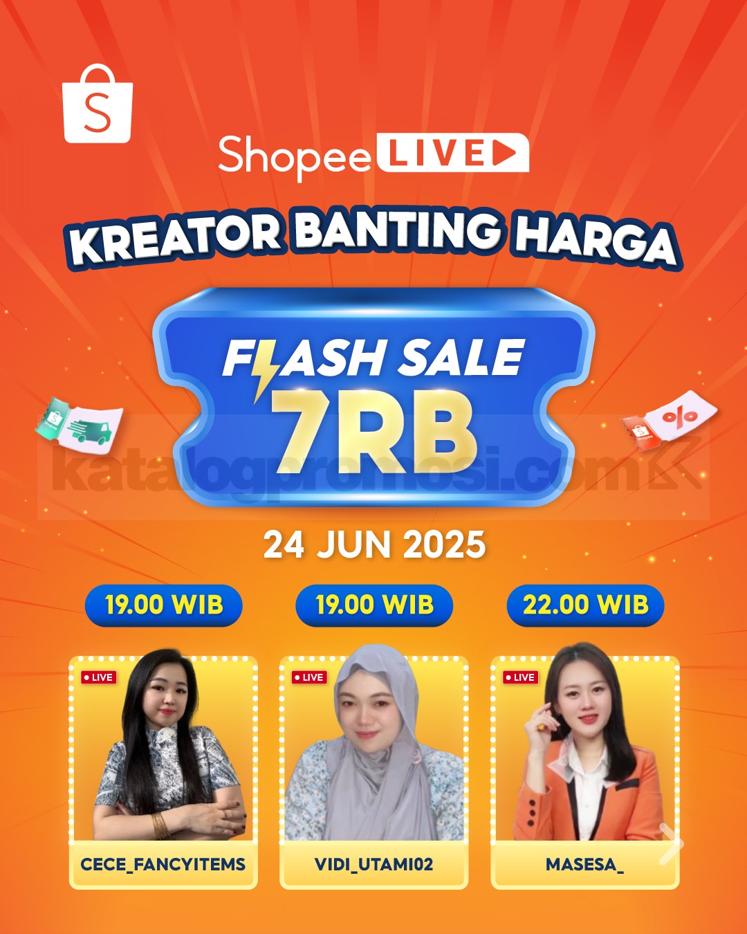 Spesial tanggal 24 sampai 26 Juni, pasang alarm kamu, karena para kreator bakal kasih flash sale 7 ribu langsung di Shopee Live. Tinggal nonton live mereka, pantengin produknya, dan langsung checkout. Simple, hemat, dan pastinya seru! ✨