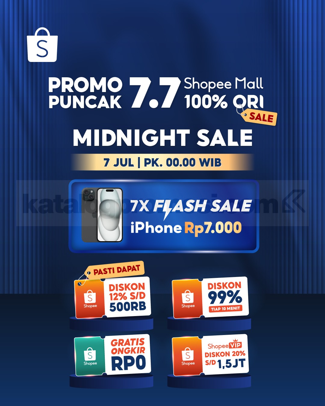 Promo Shopee Mall 7.7 100% Ori Sale! Midnight Sale mulai 7 Juli 2025 jam 00.00 WIB, diskon hingga 99%, Flash Sale iPhone Rp7.000, gratis ongkir, diskon tambahan ShopeeVIP!