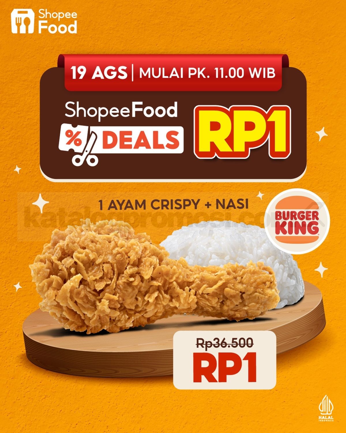 Hari ini waktunya makan enak super hemat bareng ShopeeFood Deals! Mulai jam 11.00 WIB, kamu bisa dapetin menu Ayam Crispy + Nasi Burger King cuma Rp1 aja. Tinggal bayar ongkir, langsung bisa nikmatin paket kenyang tanpa bikin kantong bolong.