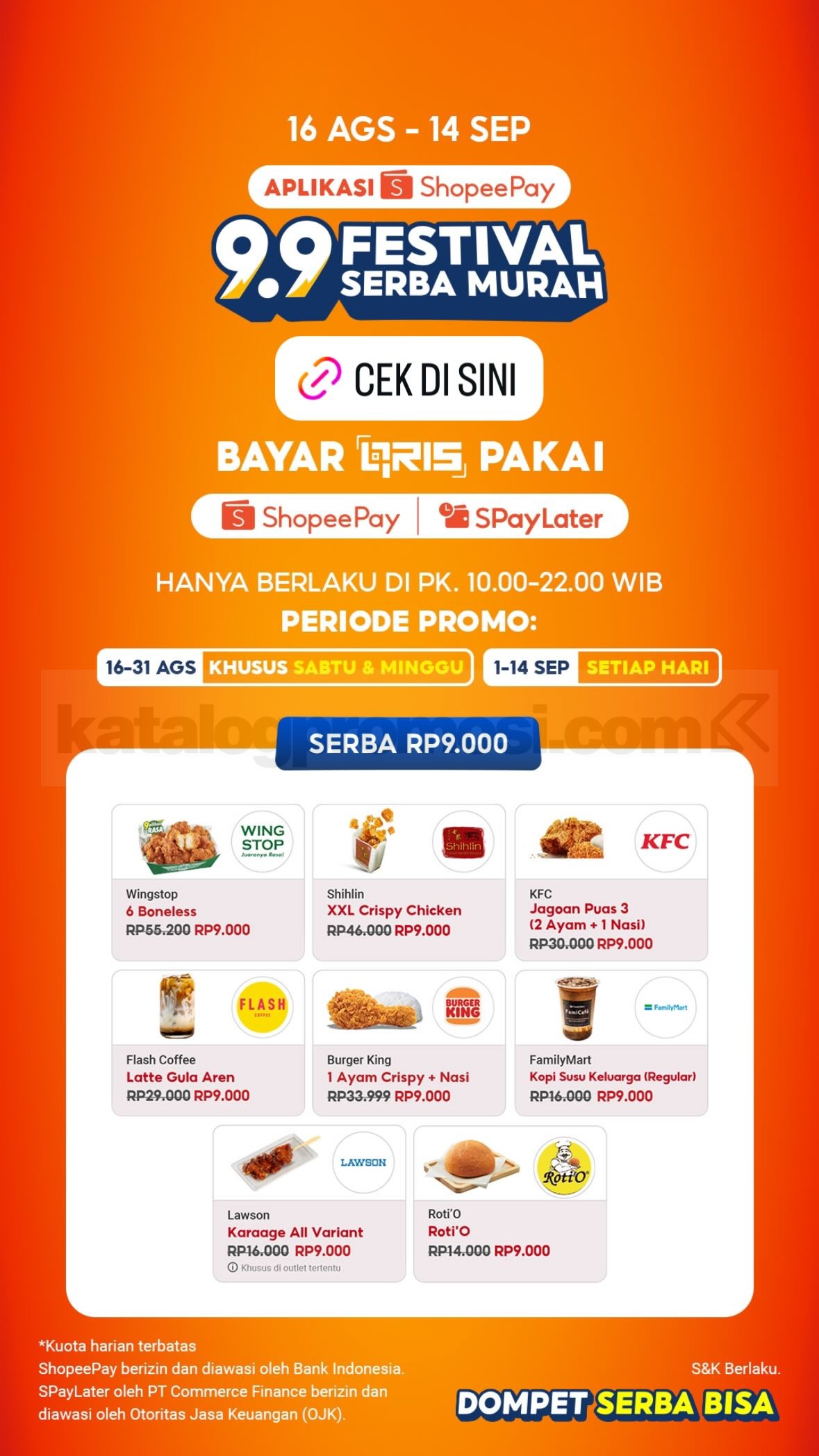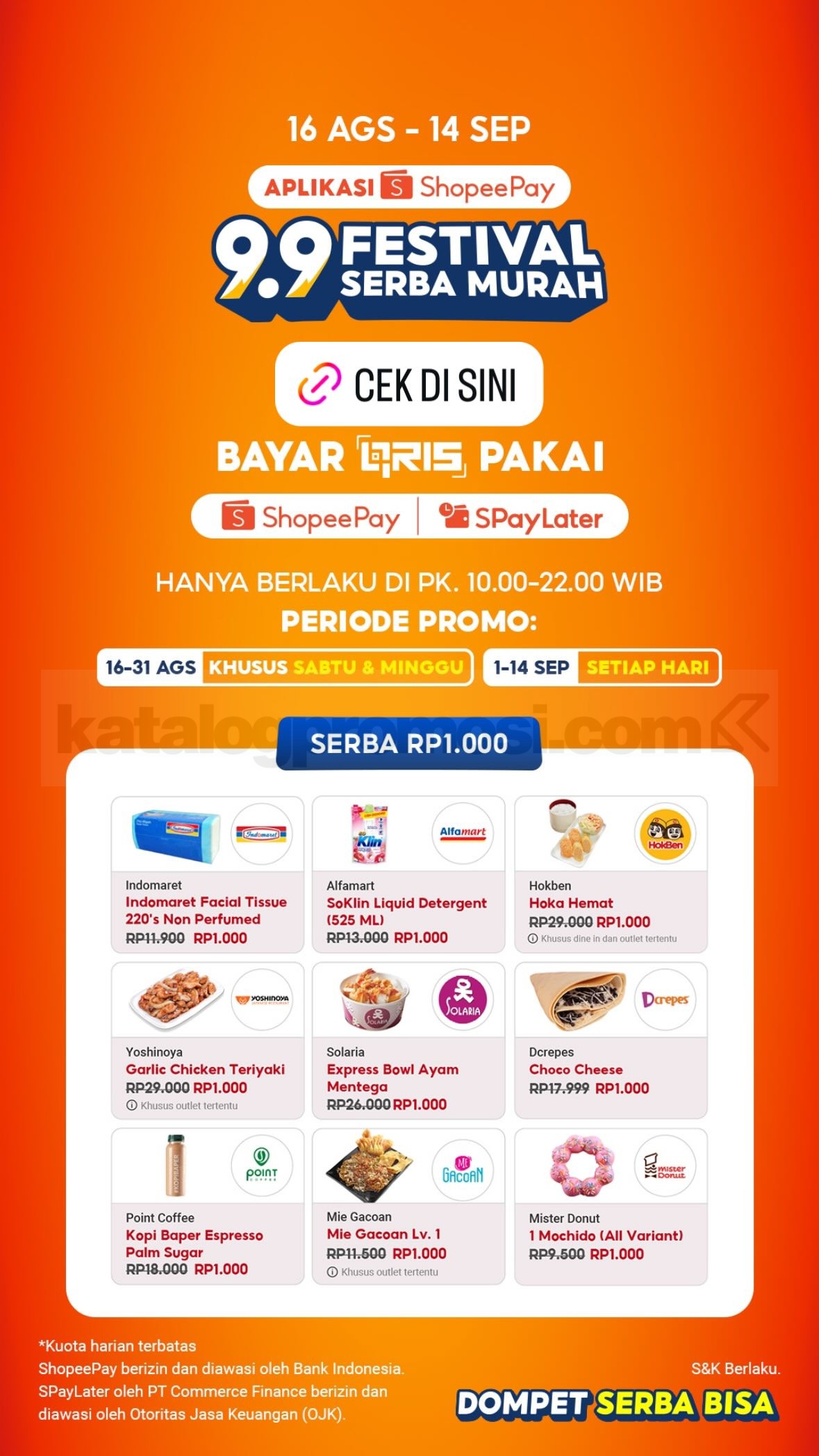 Promo ini berlangsung 16 Agustus–14 September 2025 dengan kuota terbatas setiap harinya. Ada 2 kategori penawaran, yaitu Serba Rp1.000 dan Serba Rp9.000, yang bisa kamu nikmati di merchant F&B hingga retail pilihan.