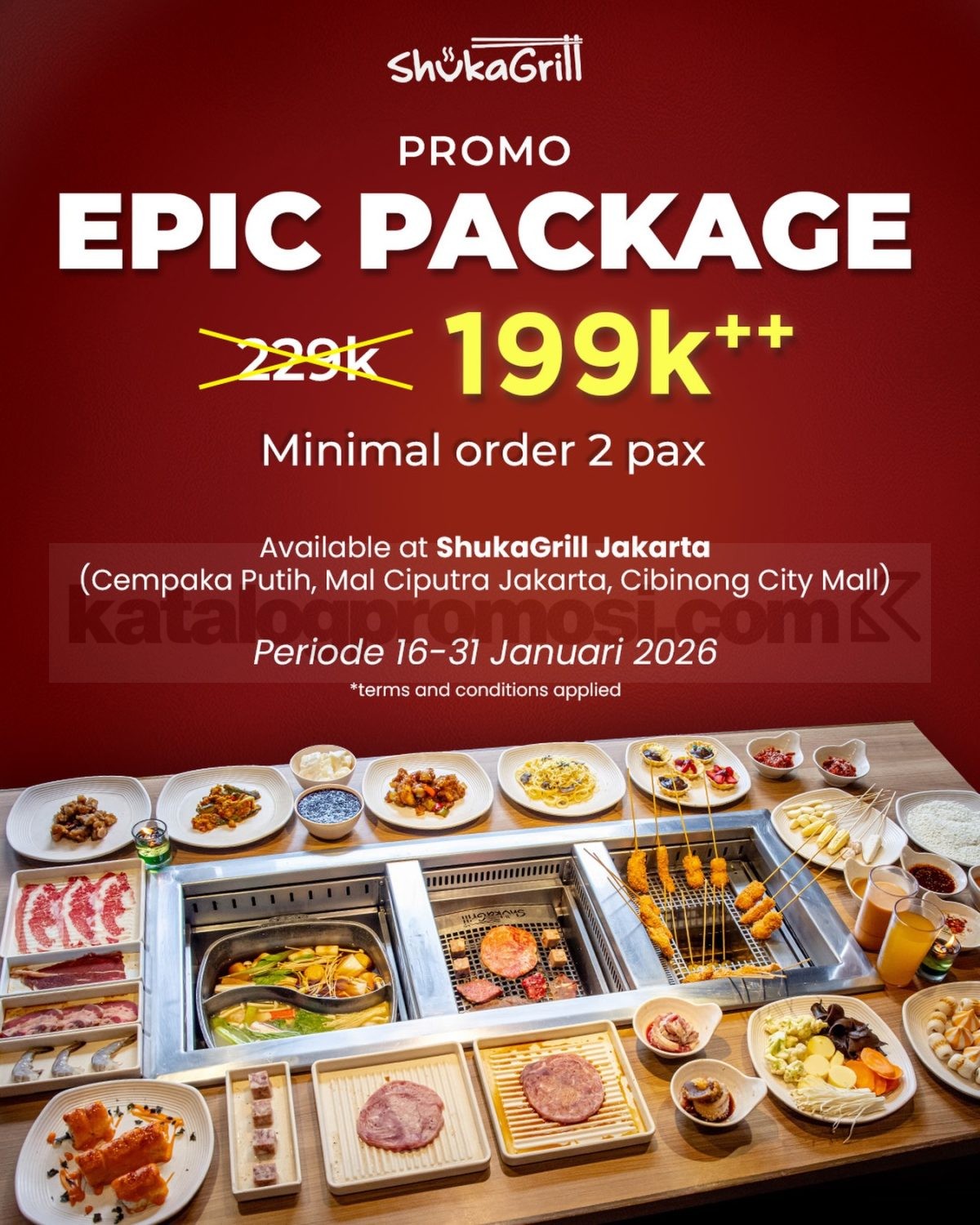 Promo ShukaGrill Jakarta Epic Package Rp. 199.000++ all you can eat dengan minimal 2 pax, mekanisme mudah, berlaku mulai tanggal 16 Januari 2026 – 31 Januari 2026 di lokasi tertentu.