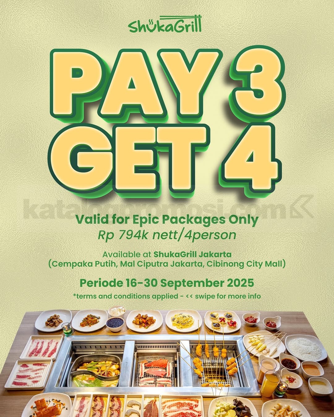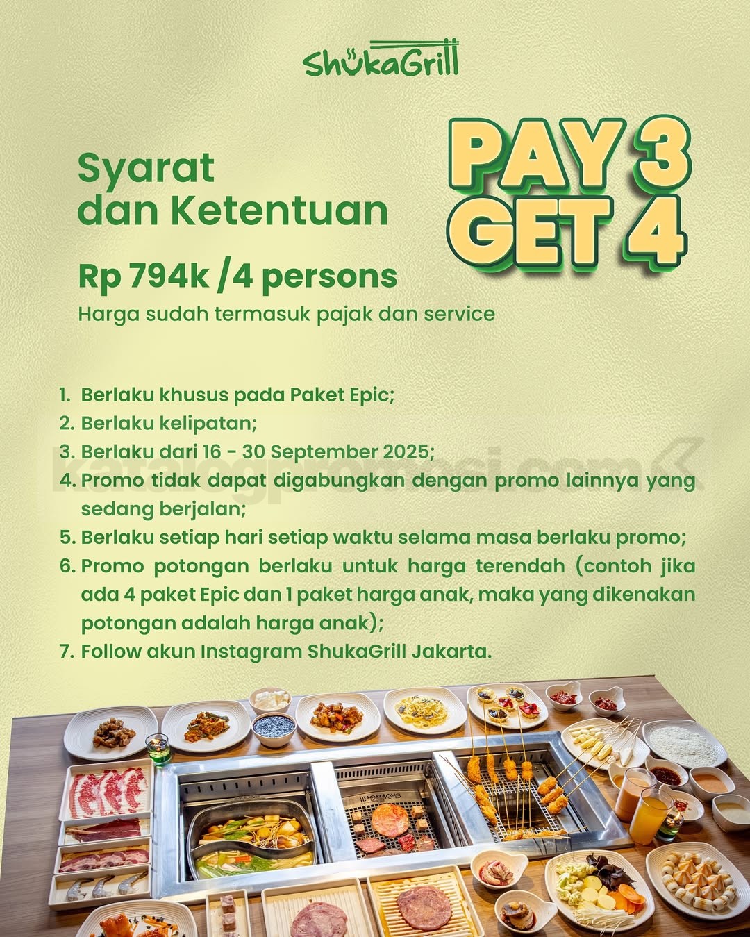 Promo SHUKAGRILL Jakarta Pay 3 Get 4 khusus Paket Epic berlaku 16 β 30 September 2025 di Cempaka Putih, Mal Ciputra Jakarta, dan Cibinong City Mall.