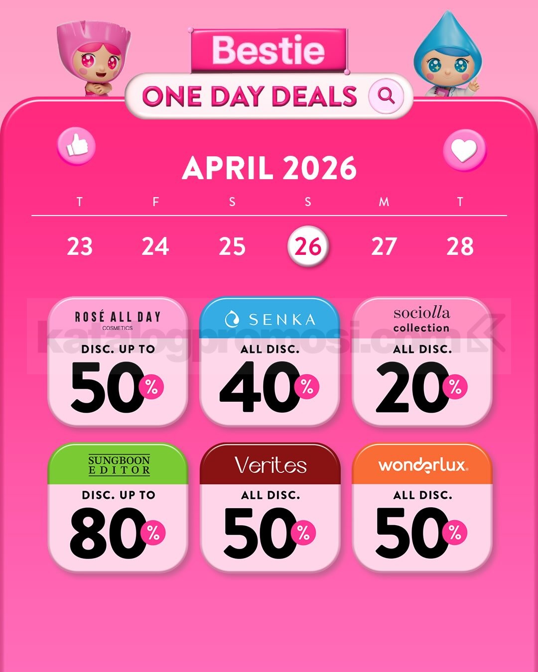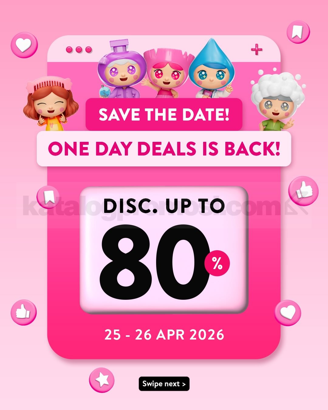 Promo Sociolla One Day Deals diskon hingga 80% belanja produk favorit via toko dan SOCO App berlaku 25 April 2026 – 26 April 2026 di seluruh outlet.