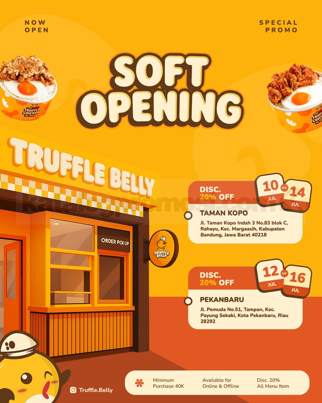 Promo Truffle Belly Soft Opening BSB City Semarang Diskon 20% untuk semua menu min. pembelian Rp. 40.000, berlaku 1β5 Desember 2025 untuk online & offline