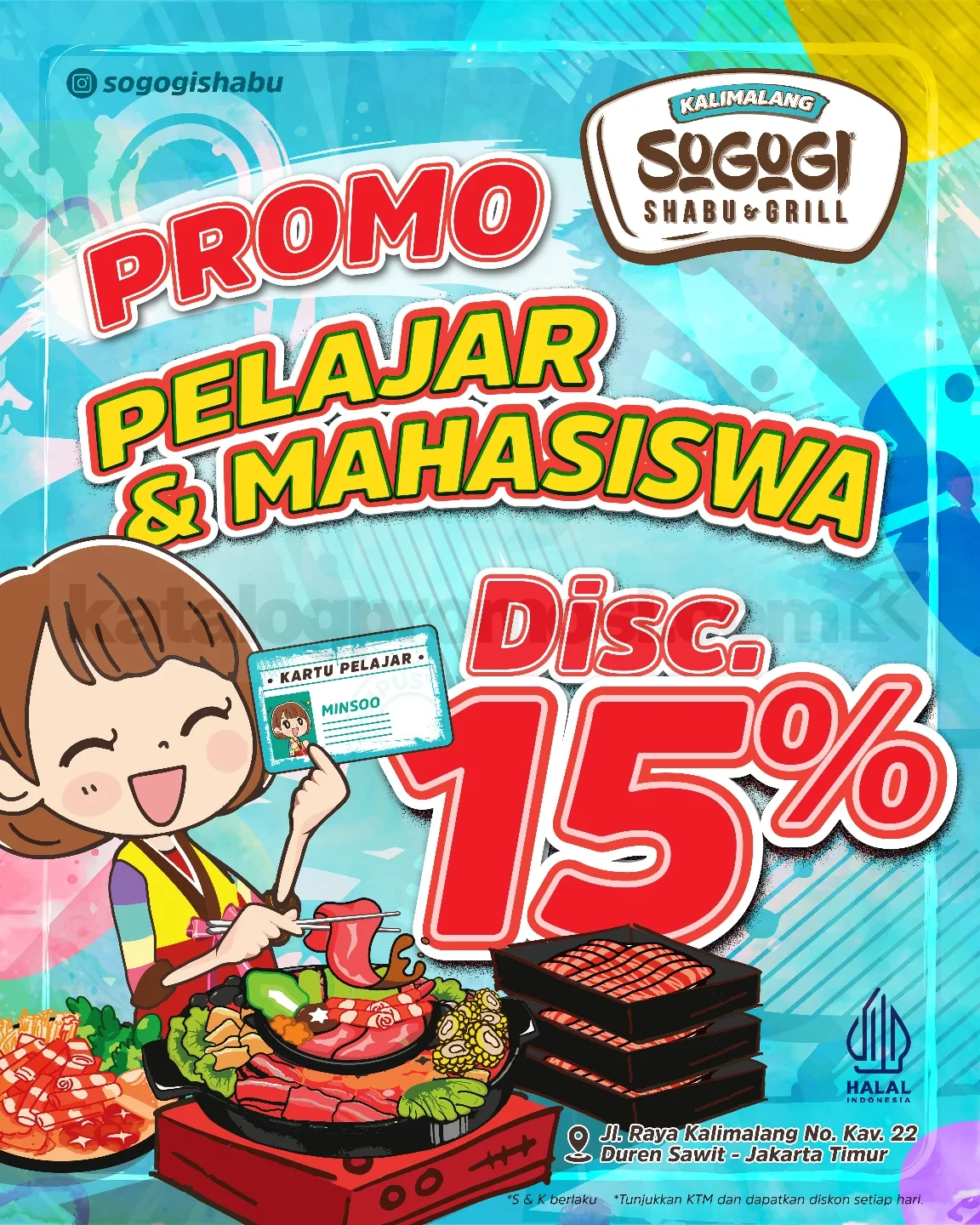 Diskon 15% hanya berlaku untuk makan di tempat (dine-in) di Sogogi Shabu & Grill Kalimalang.