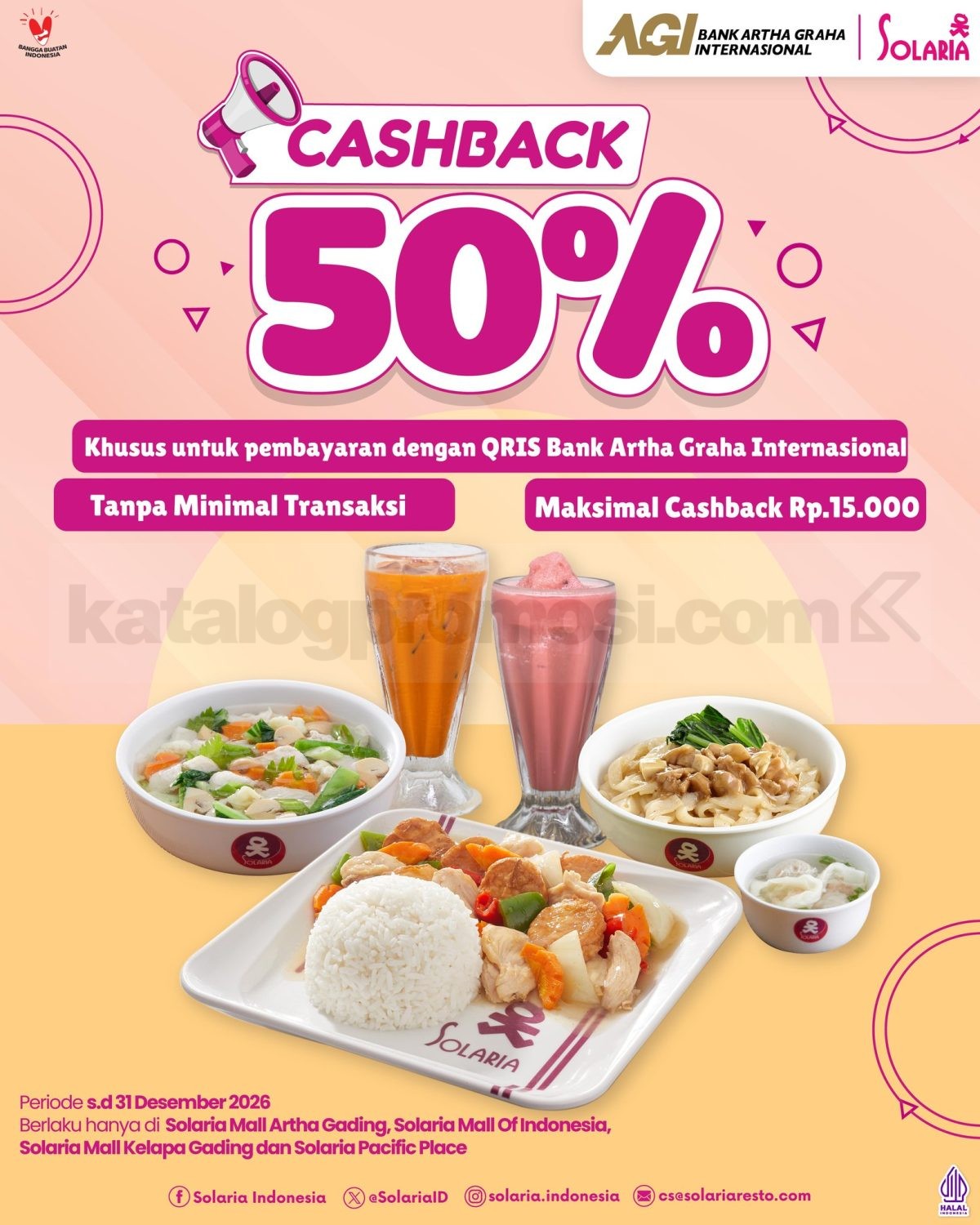 Promo Solaria Bank Artha Graha International Cashback 50% maks Rp. 15.000 pembayaran QRIS tanpa minimal transaksi berlaku hingga tanggal 31 Desember 2026 di lokasi tertentu.