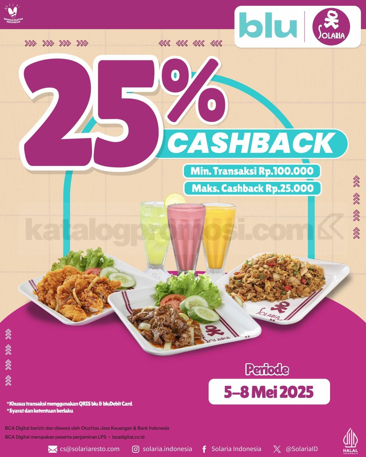 Cukup bayar pakai QRIS blu atau bluDebit Card BCA di semua outlet Solaria, dan nikmati cashback 50% hingga maksimal Rp. 50.000 per user per periode. Minimal transaksi hanya Rp. 100.000, berlaku hingga 31 Desember 2025, tapi kuota terbatas, jadi pastikan kamu gercep sebelum promo habis!