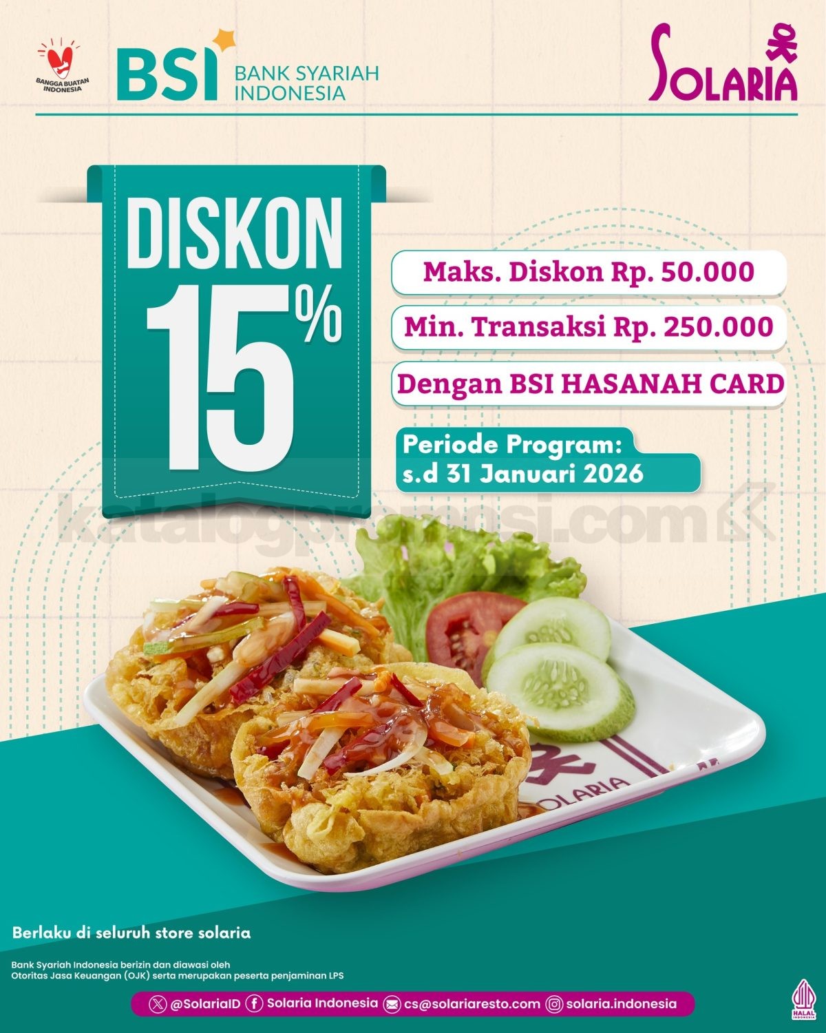 Promo Solaria BSI Hasanah Card Diskon 15% untuk transaksi minimal Rp. 250.000 dengan kartu BSI Hasanah, berlaku sampai tanggal 31 Januari 2026 di seluruh outlet.